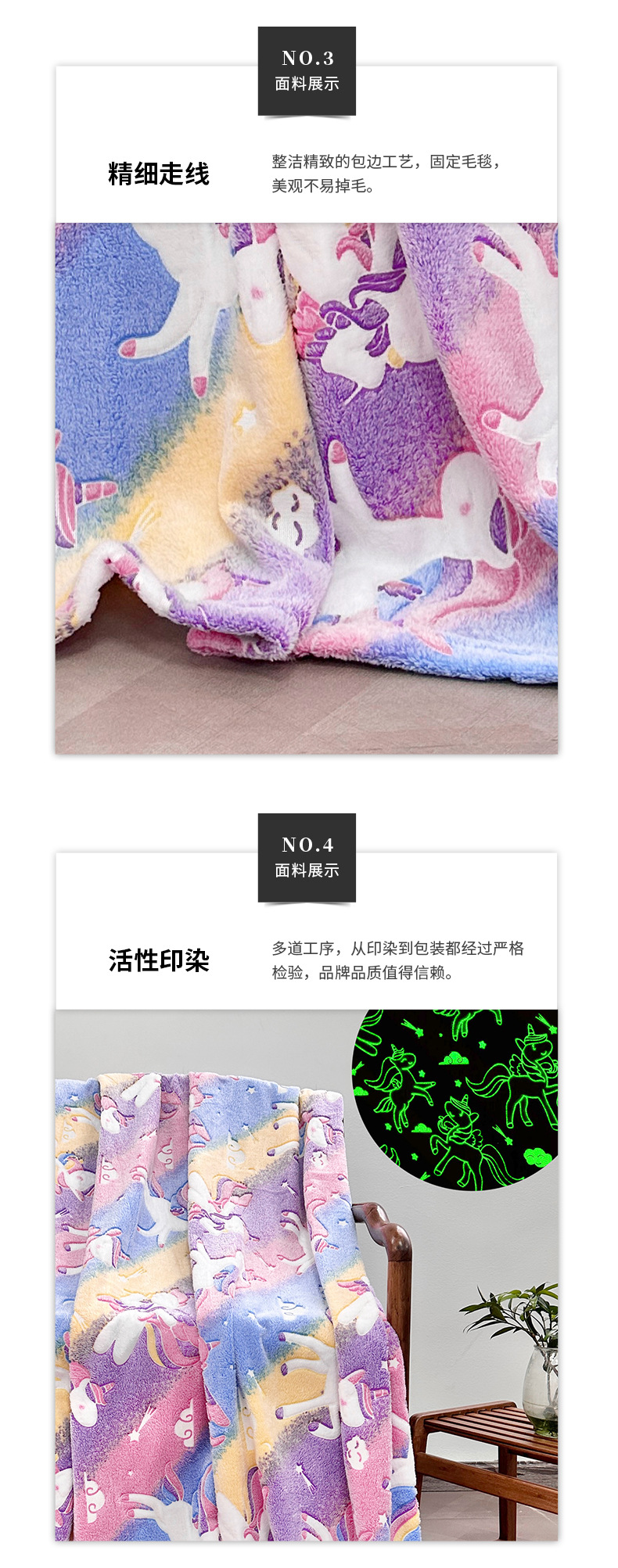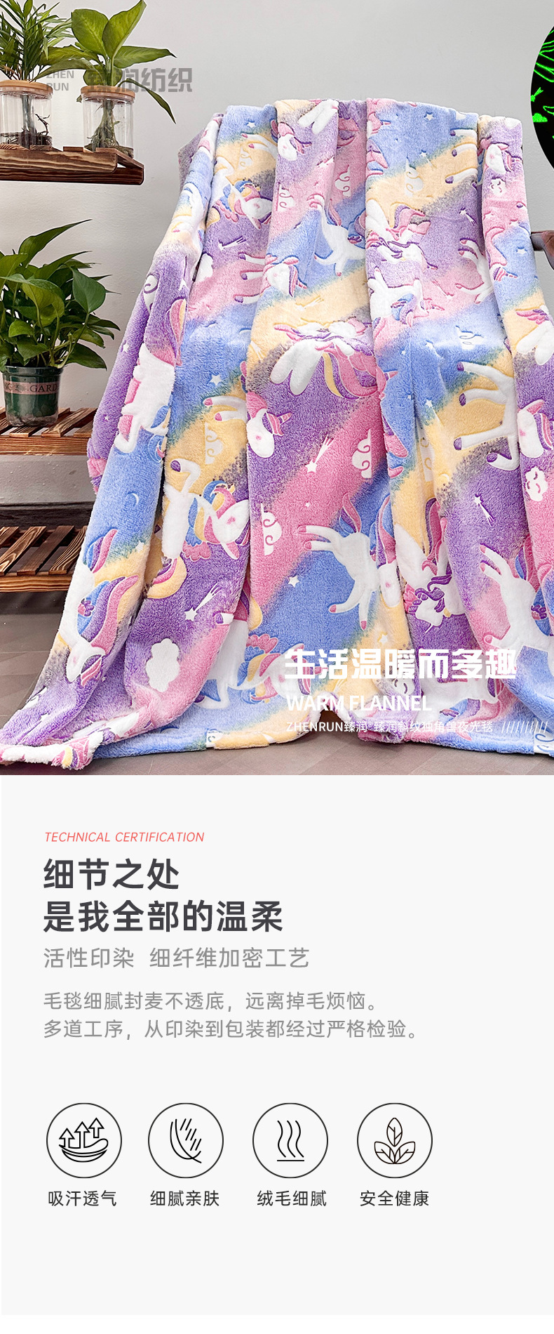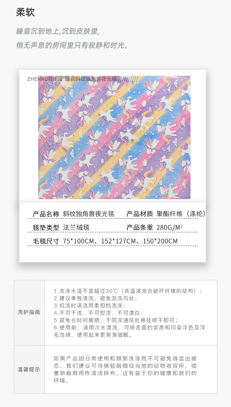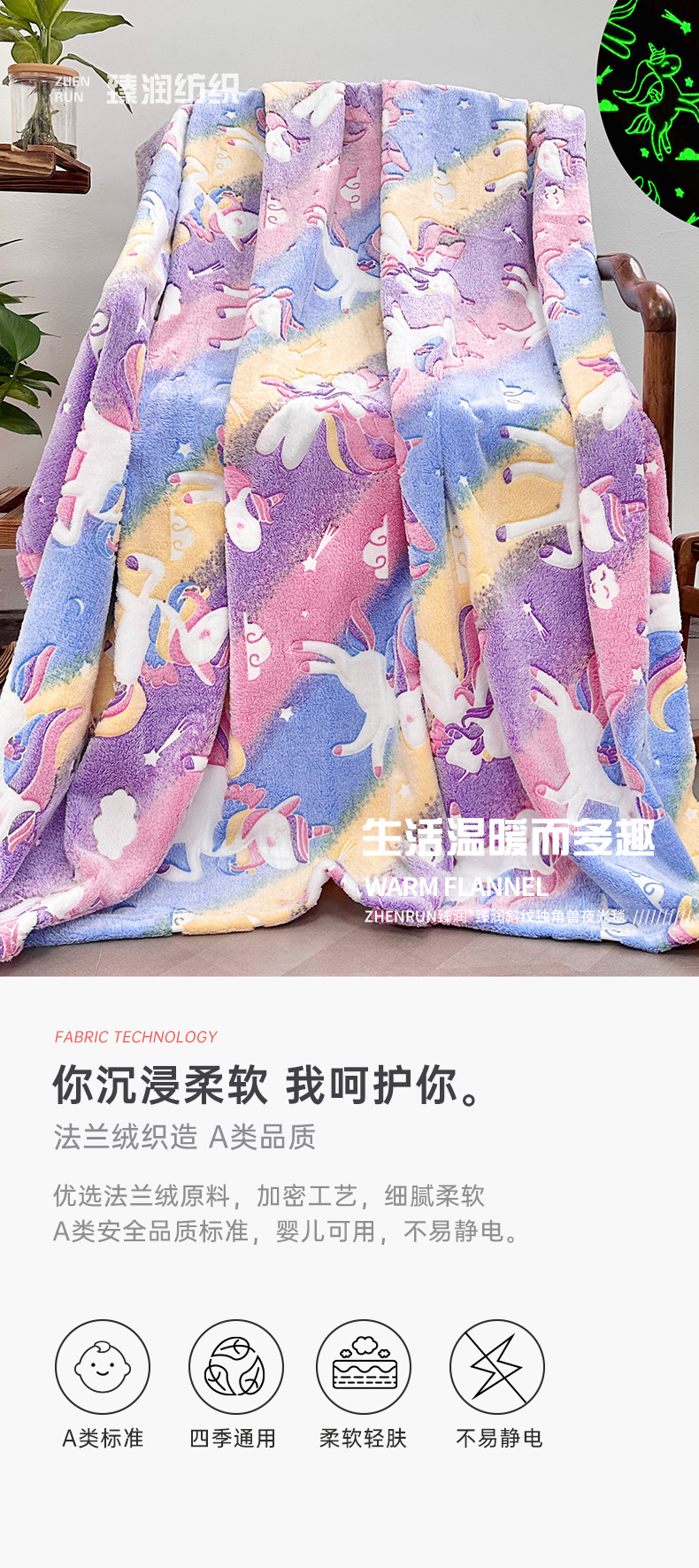 斜纹独角兽夜光发光毯彩虹飞马儿童盖毯保暖汽车卧室办公室午睡毯 English | 投诉