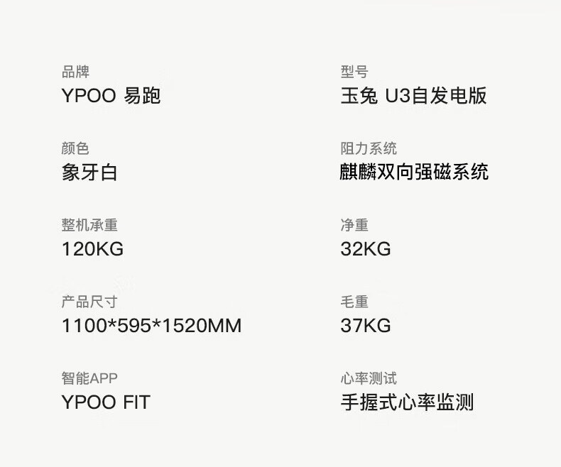 品牌: 易跑 图案: 其他/other 产地: 中国 教材模式: APP课程 上市时间: 2021年冬季 货号: 玉兔U3椭圆机 是否商场同款: 是 销售渠道类型: 商场同款(线上线下都销售) 智能类型: 其他智能 坡度调整方式: 固定坡度 重量: 0.5 kg/件