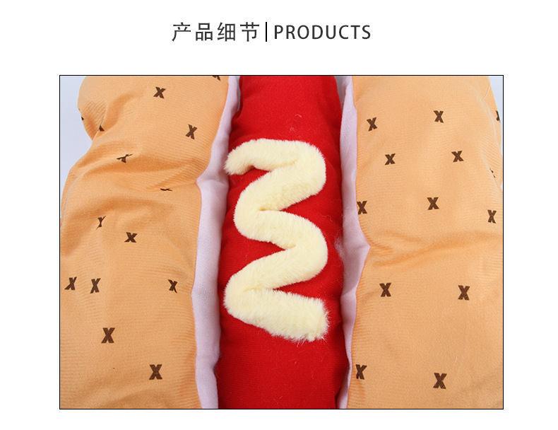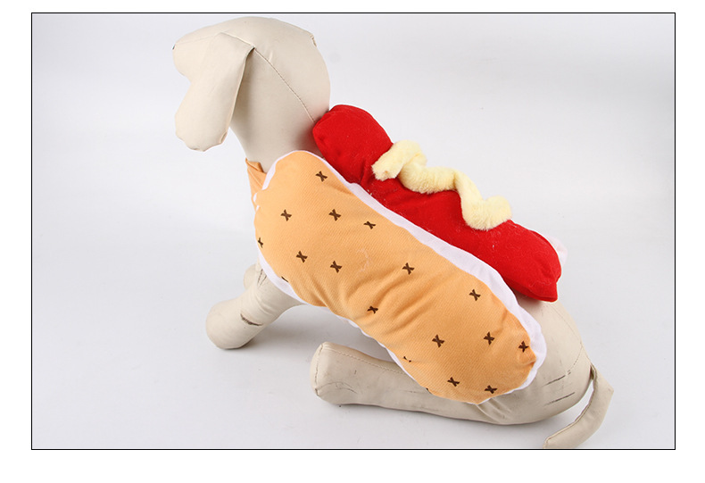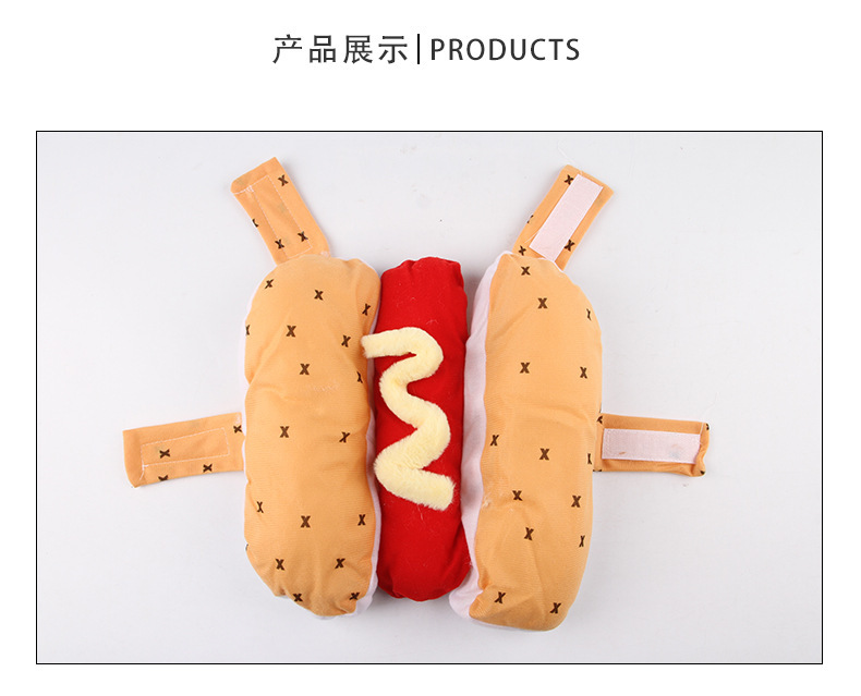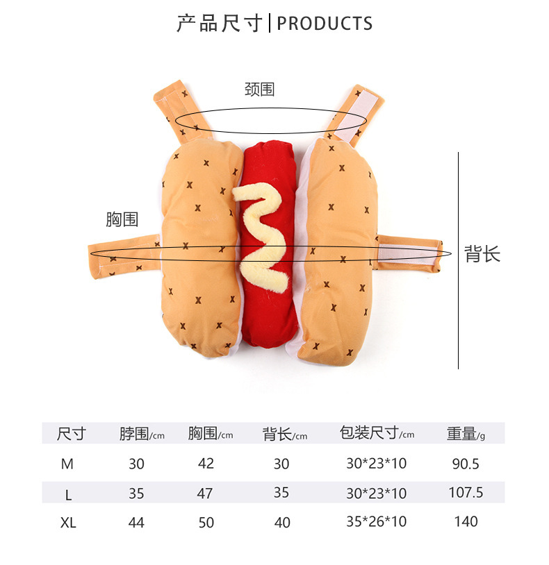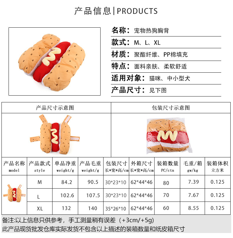 产地: 浙江 是否进口: 否 产品类别: 变身装 风格: 欧美 货号: B16215 品牌: 宠太郎 适用性别: 通用 是否专利货源: 否 颜色: 热狗装 尺码: S,M,L 重量: 0.45 kg/个