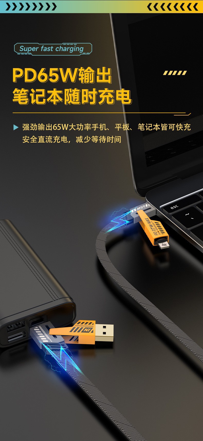 【产品亮点】:一线二头设计,硅胶加粗手感更好,耐拉伸,防缠绕,智能涓流,Type-c接口支持数据传输,支持苹果15手机,部分笔记电脑,平板电脑充电