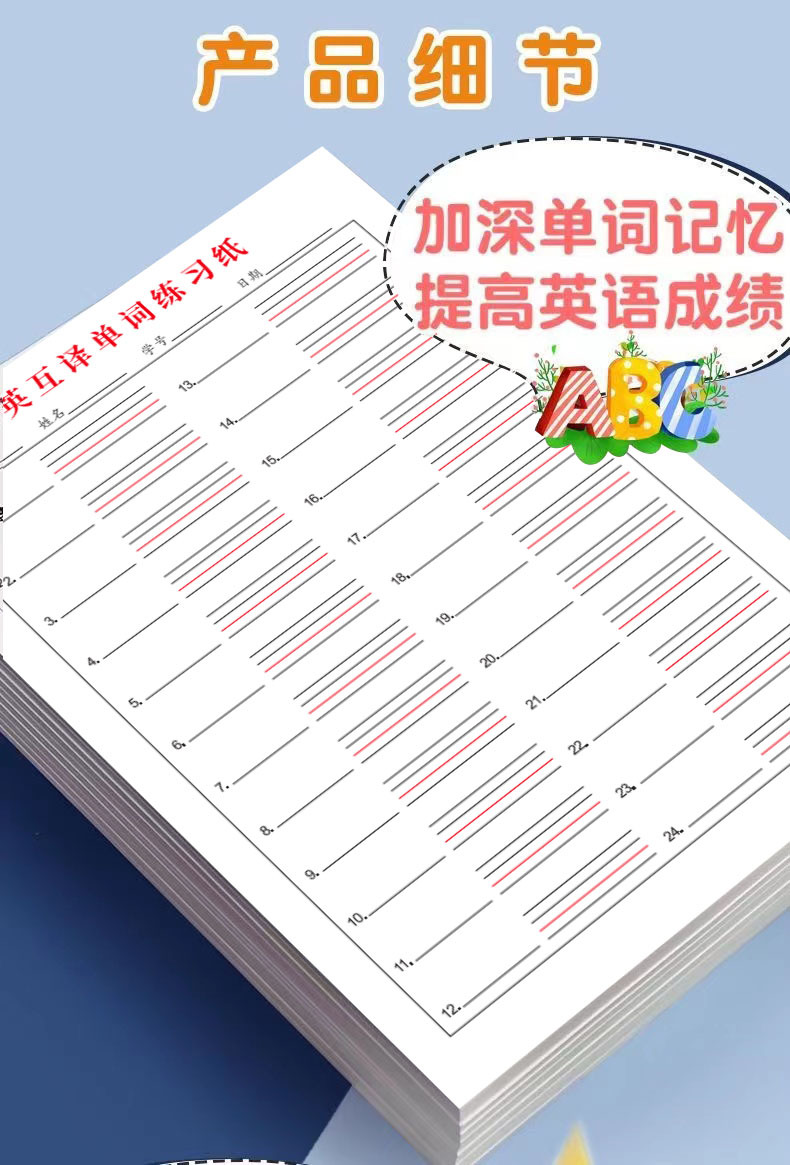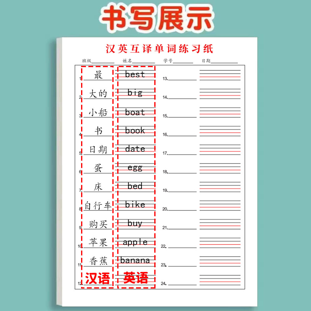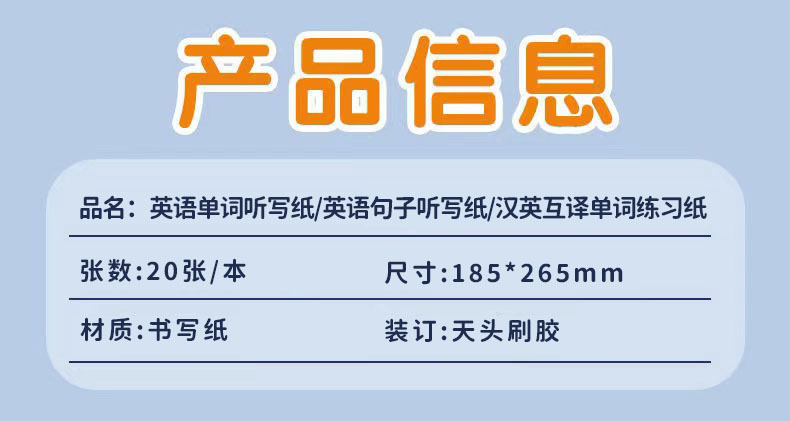 品牌: other 货号: 汉英互译听写纸 材质: 纸 是否进口: 否 内文纸张页数: 20张 是否属于礼品: 否 是否IP授权: 否 产品类别: 其他簿/本/册 重量: 1.0 kg/本