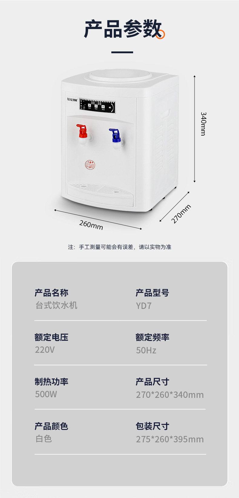 品牌: 其他 型号: YD7 货号: YD7 饮水机种类: 温热型 滤芯: 无 过滤层级: 无 水箱容量: 无 防触电: 无 额定电压: 220V 额定功率: 500W 重量: 1.0 kg/个