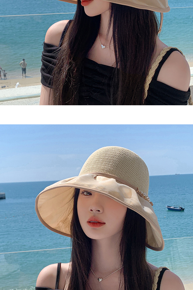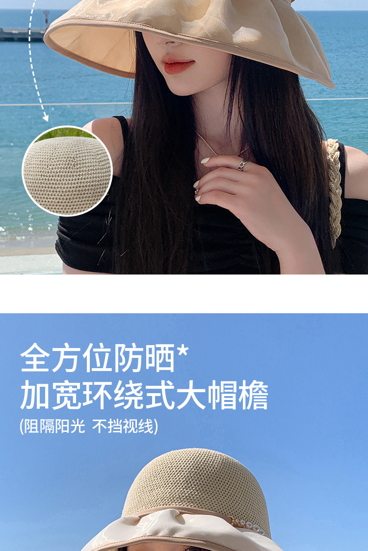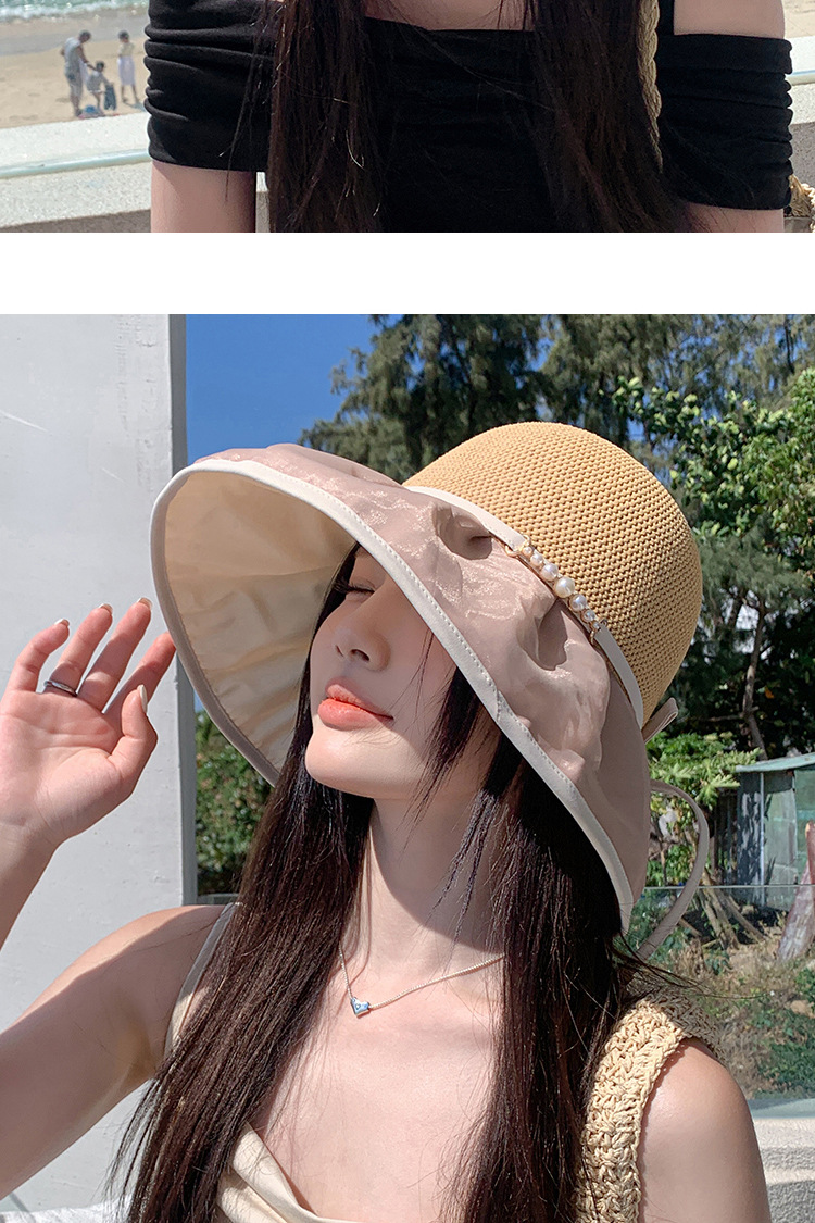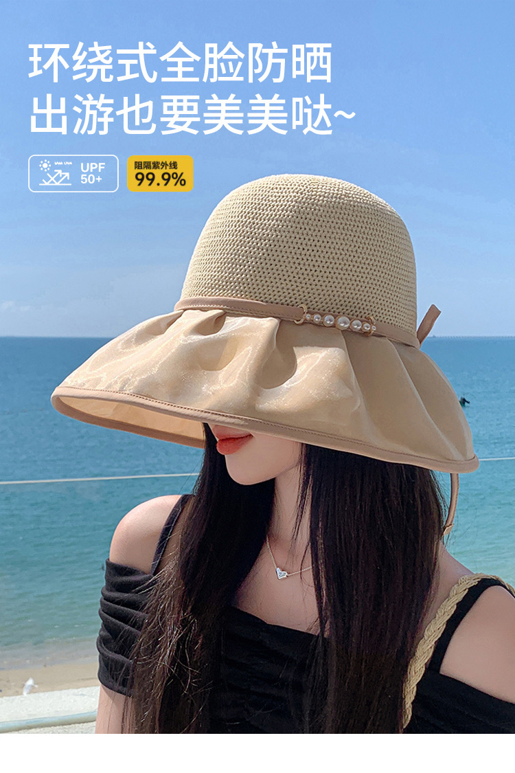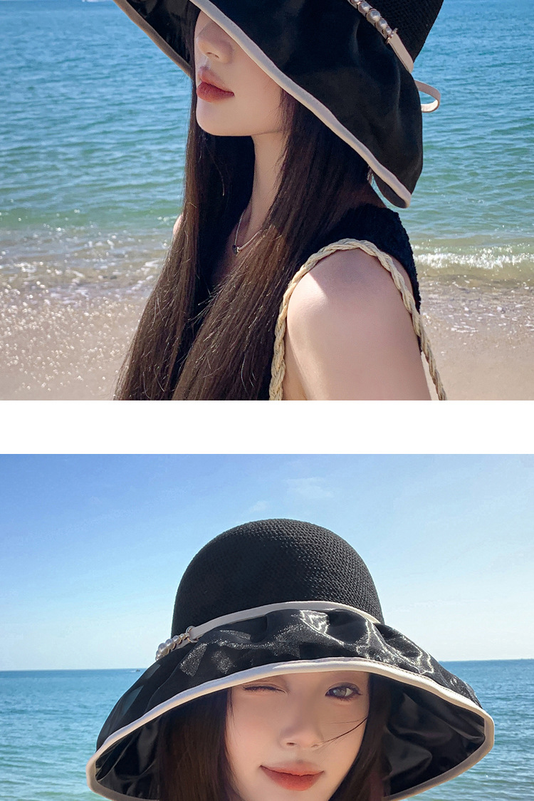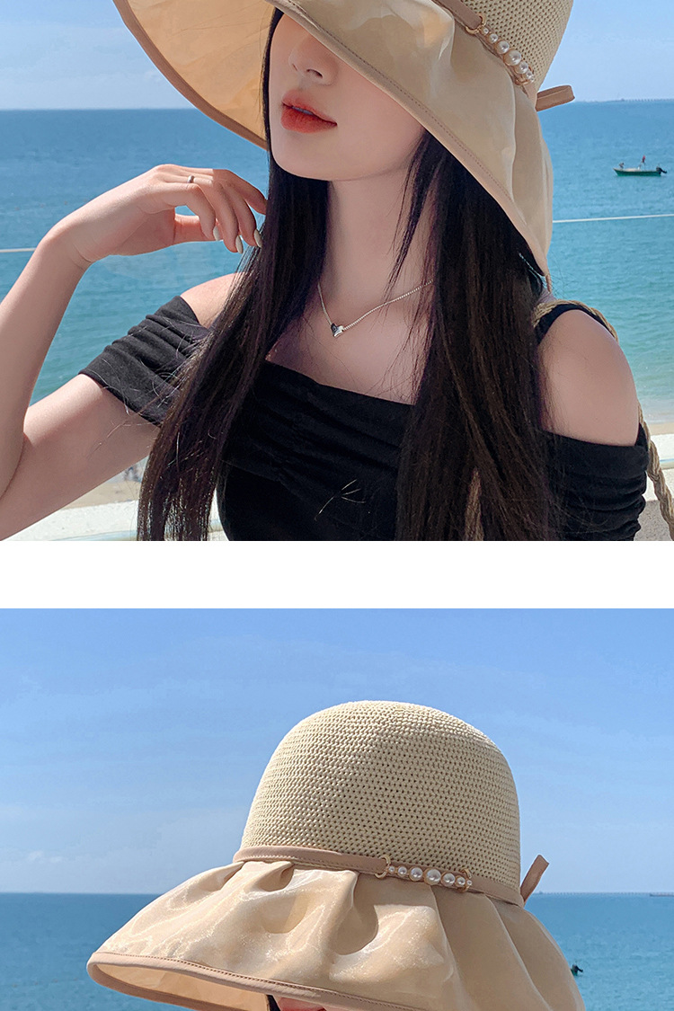 帽子女珍珠网纱大沿夏季防晒遮阳帽海边度假渔夫帽针织蝴蝶结太帽