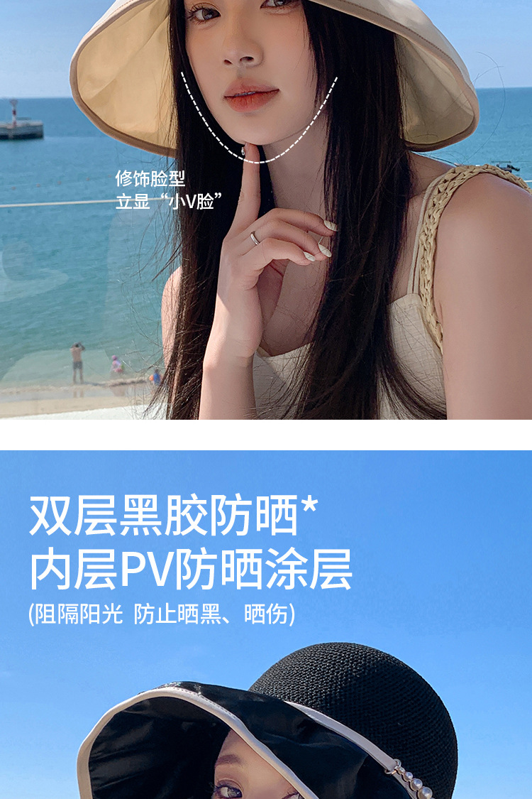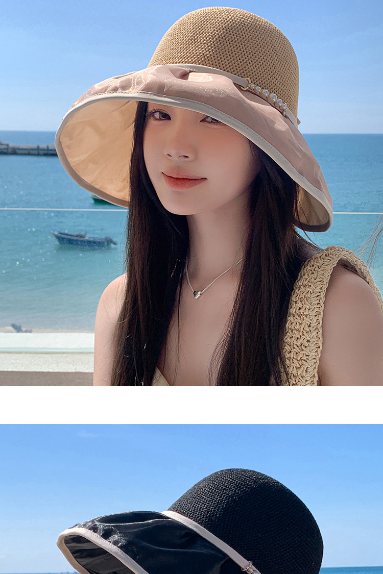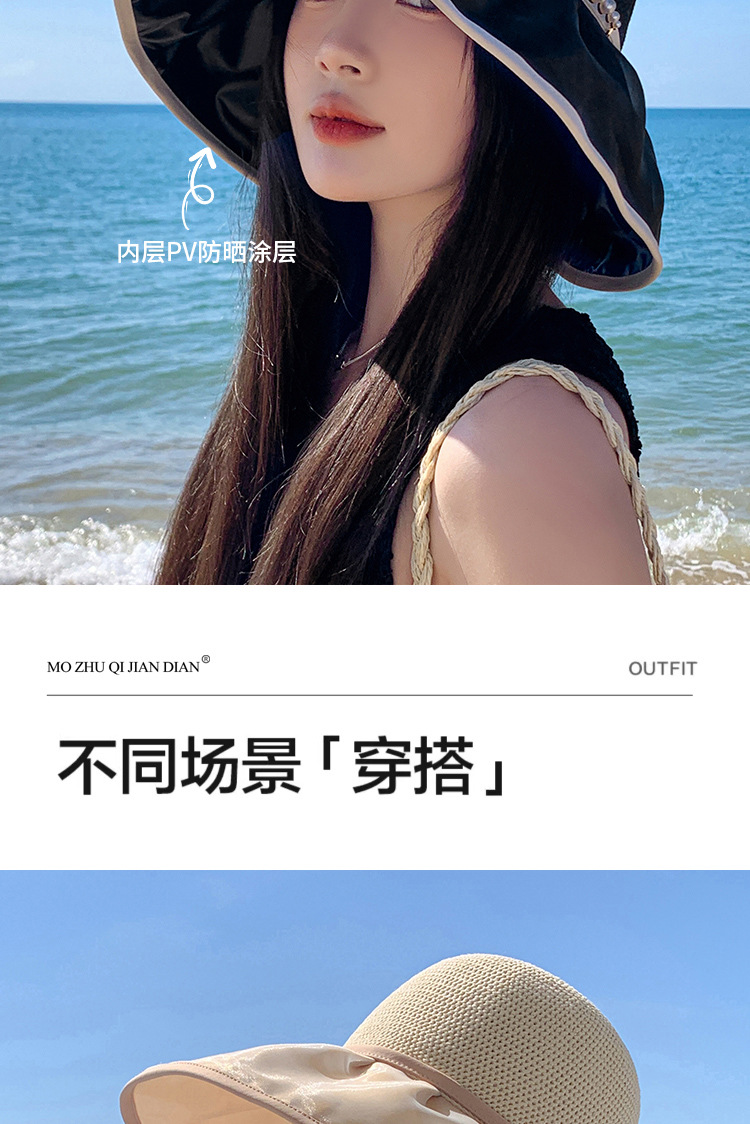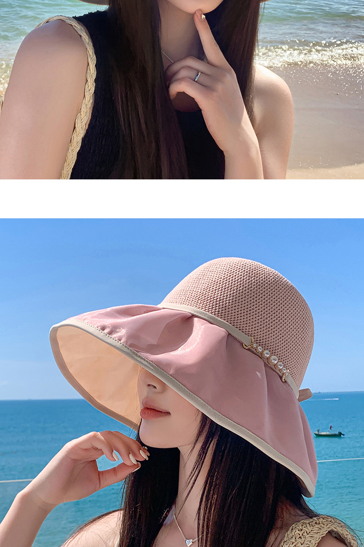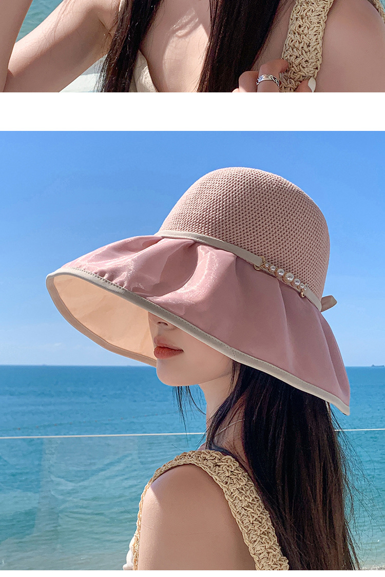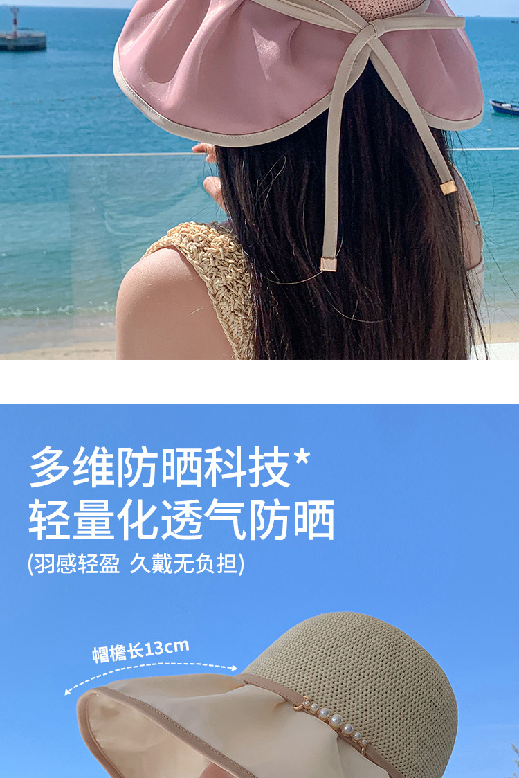 帽子女珍珠网纱大沿夏季防晒遮阳帽海边度假渔夫帽针织蝴蝶结太帽