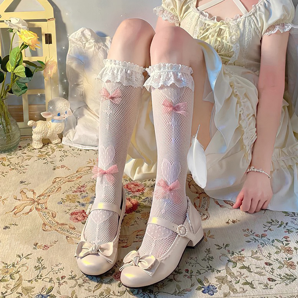 蕾丝竖条唯美蝴蝶结缎带褶皱花边网袜lolita洛丽塔中筒袜堆堆袜女