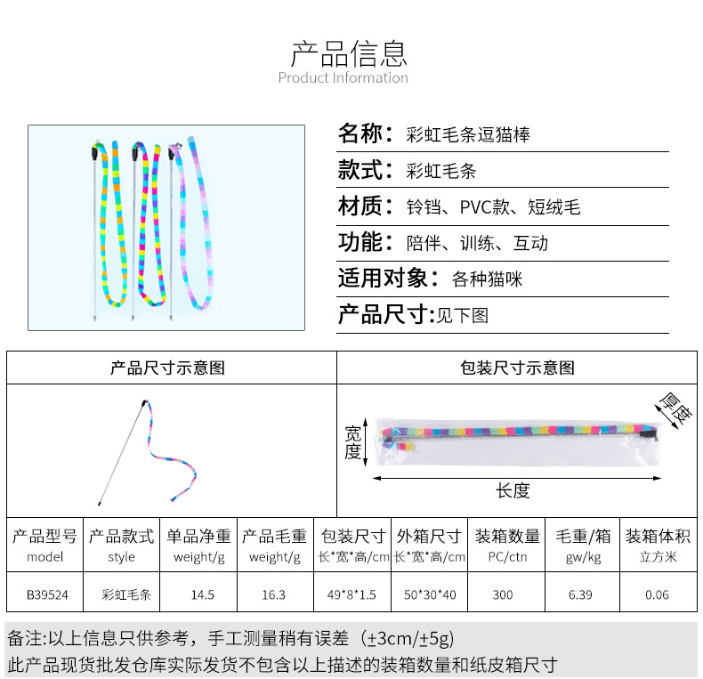 产地: 浙江 是否进口: 否 产品类别: 逗猫玩具 货号: B39524 箱装数量: 300 重量: 20g 品牌: 宠太郎 是否专利货源: 否 颜色: 绿色,粉色,彩色 主要下游平台: ebay,亚马逊,wish,速卖通,独立 重量: 0.03 kg/个