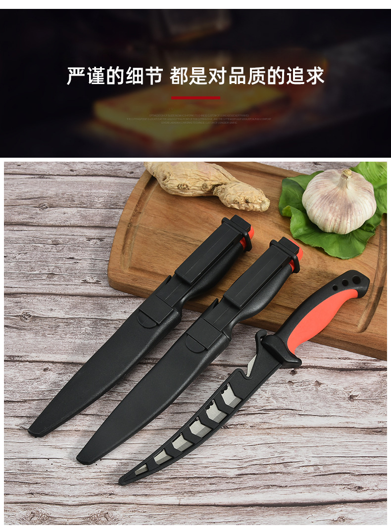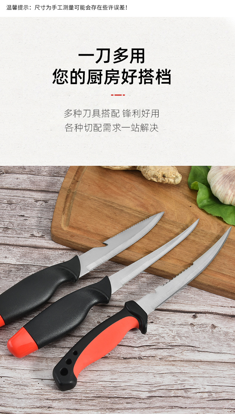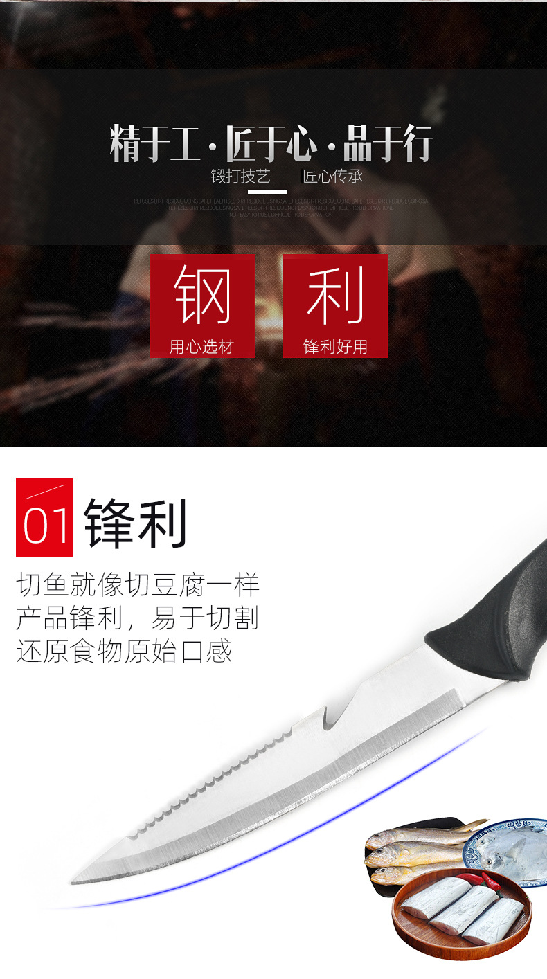 厂家现货不锈钢浮水鱼刀片鱼刀多功能厨用刀户外鱼刀锯齿刀带刀鞘 投诉