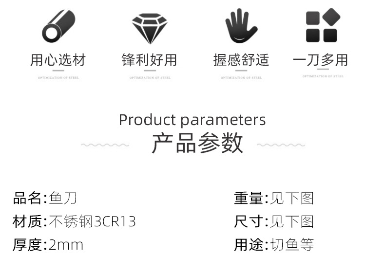 产品类别: 鱼刀 是否进口: 否 品牌: 其他 货号: 鱼刀 材质: 不锈钢 加印LOGO: 可以 加工定制: 是 产品上市时间: 2019 价格段: 20-30元 是否有专利: 否 重量: 0.5 kg/把