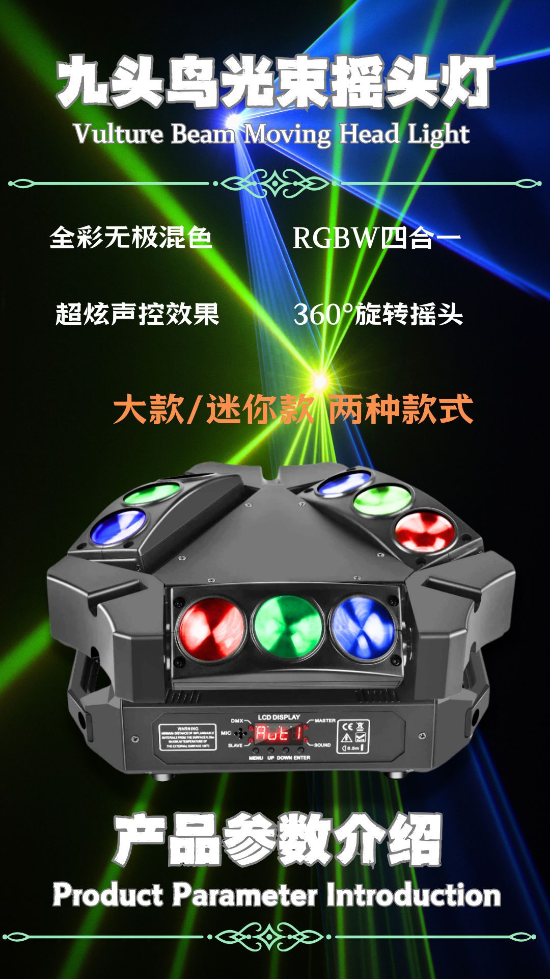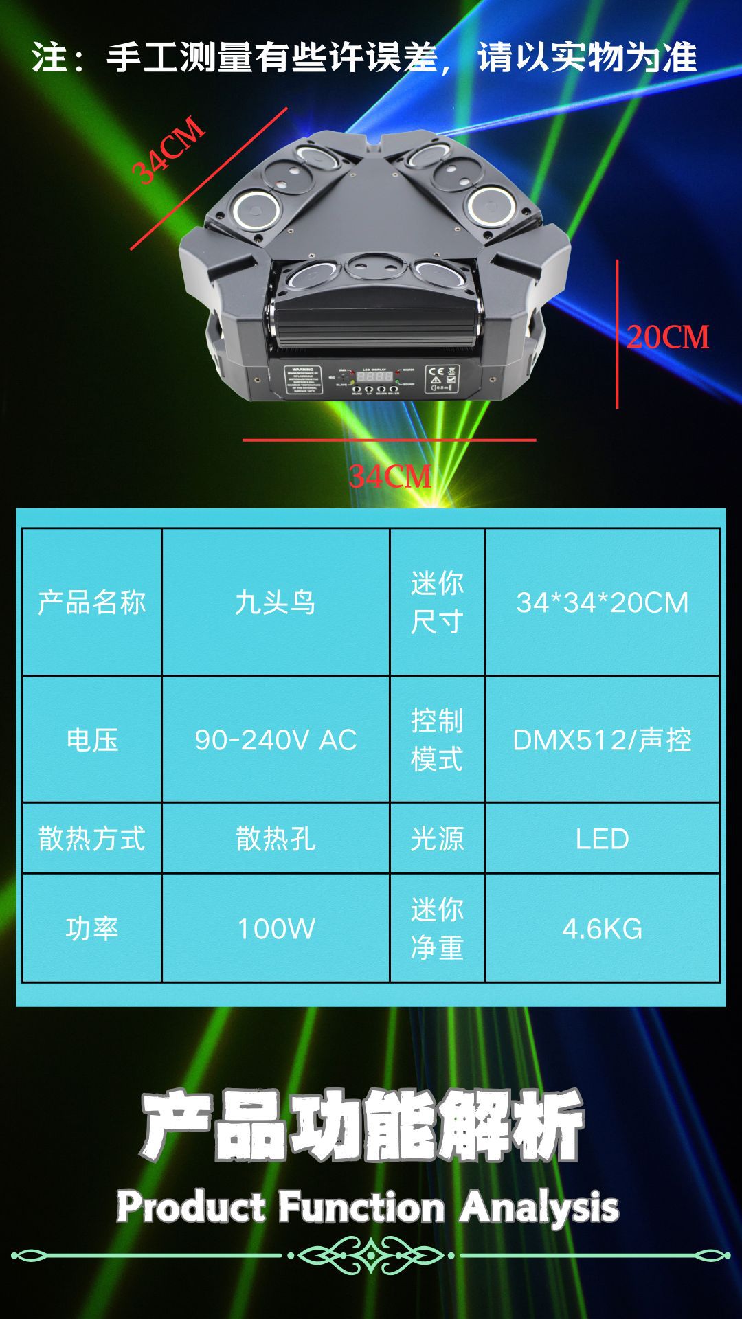 灯珠规格:9颗10W 科瑞 红绿蓝白4合1 LED