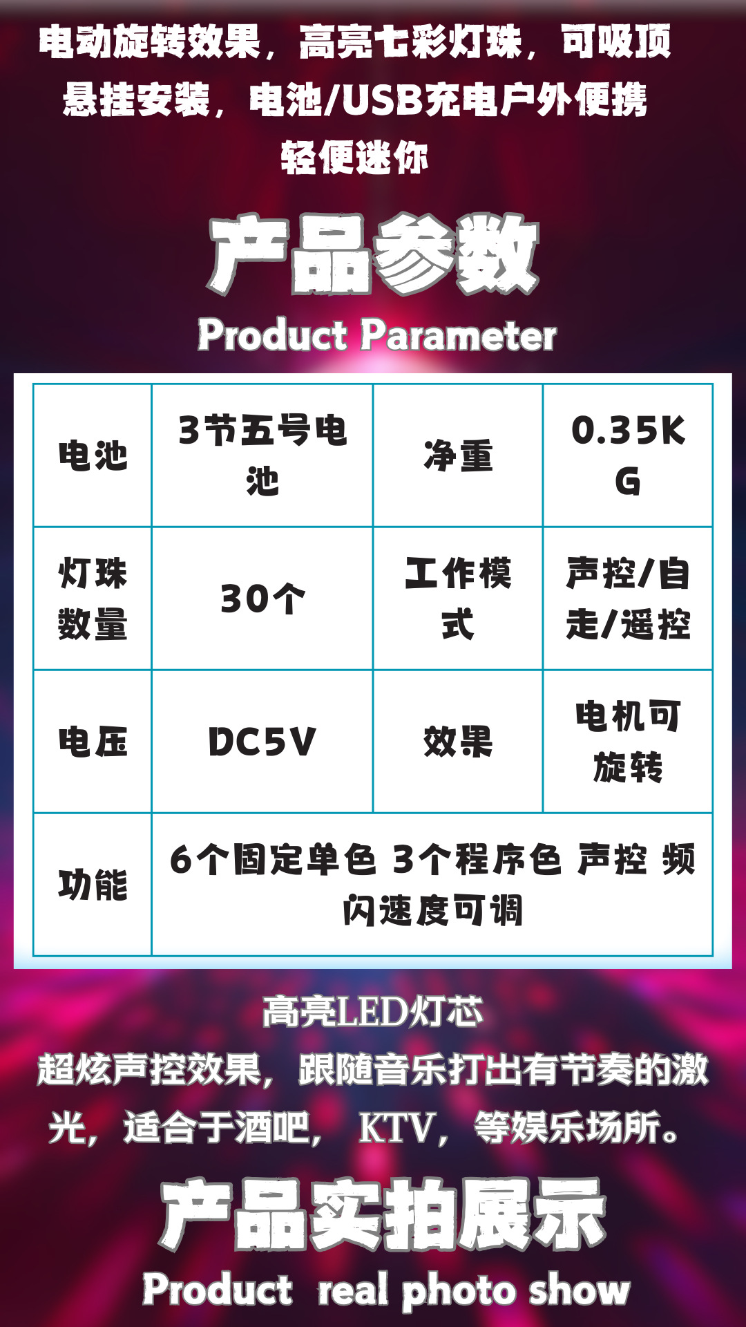 功能:6个固定单色 3个程序色 声控 频闪速度可调