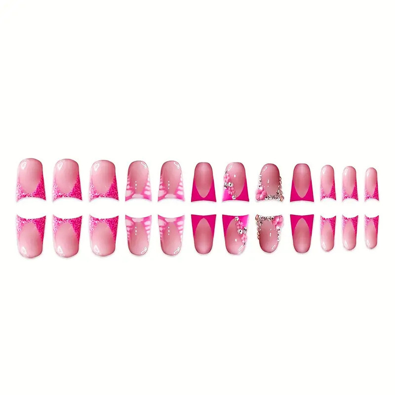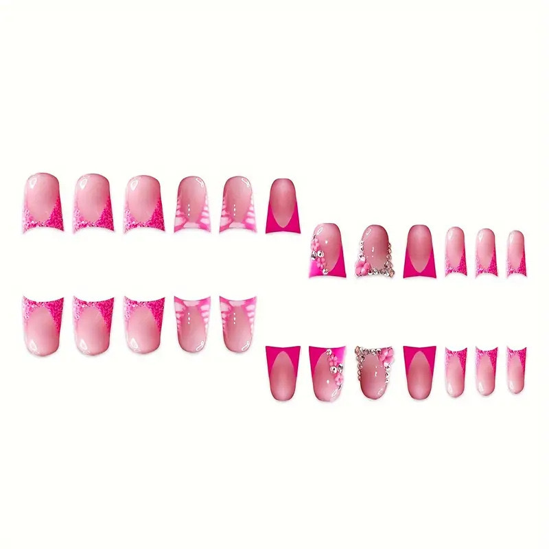 跨境热售鸭嘴型假指甲法式粉边爆闪碎钻甜美花都可拆卸假指甲批发