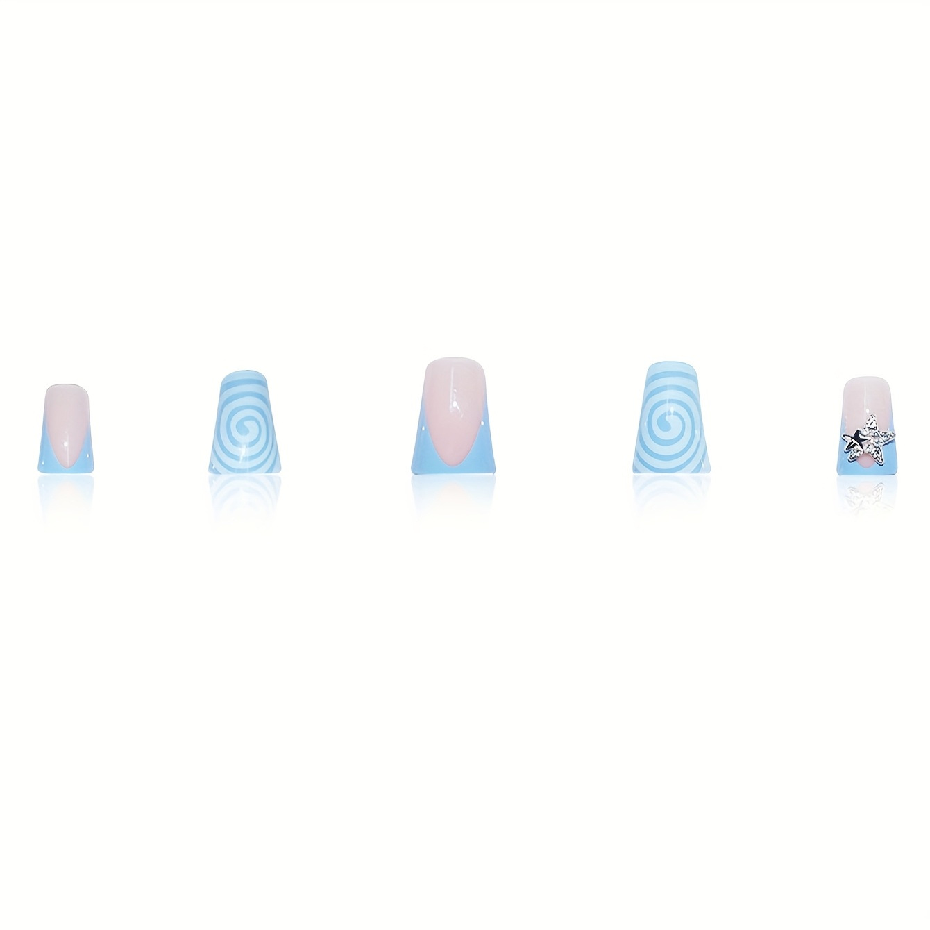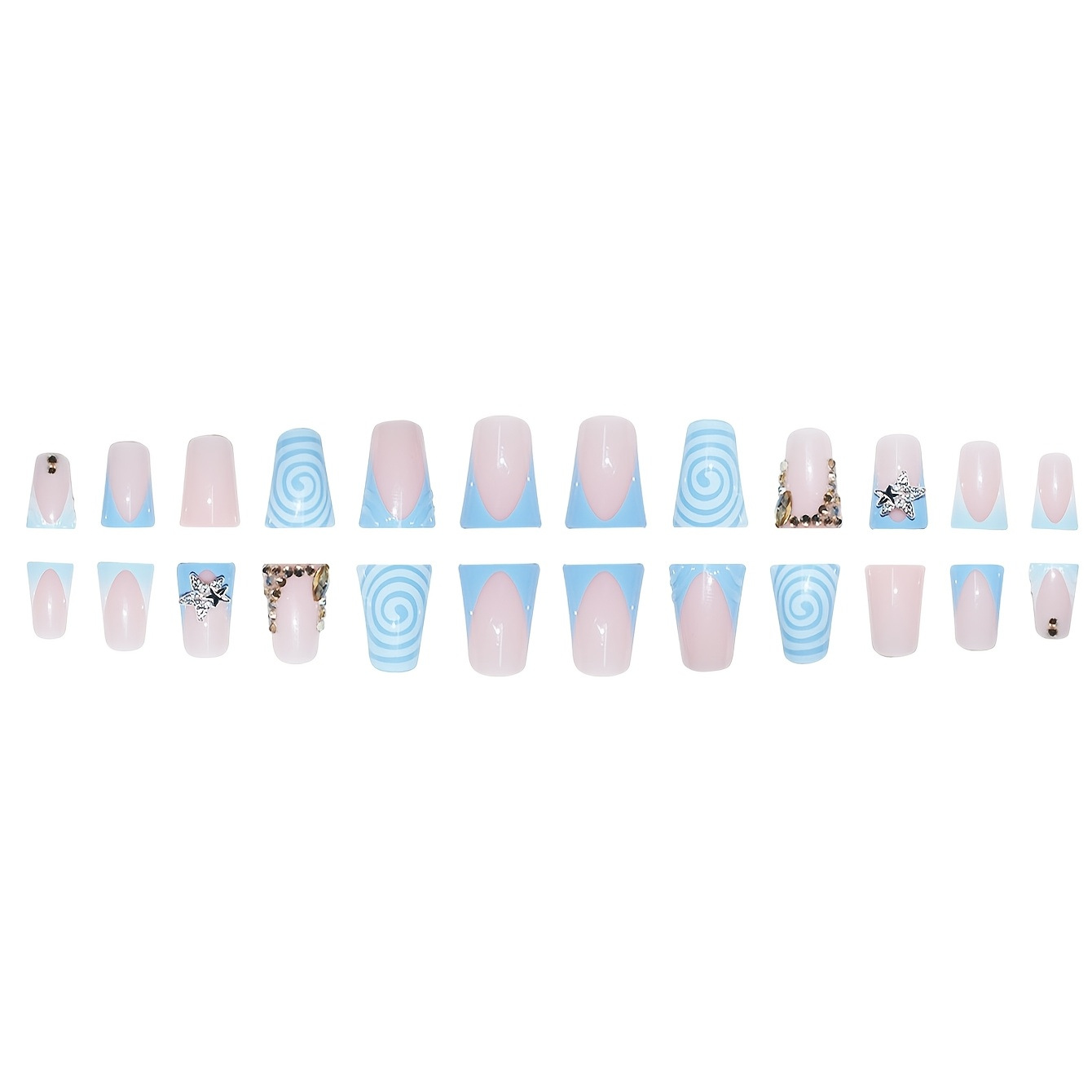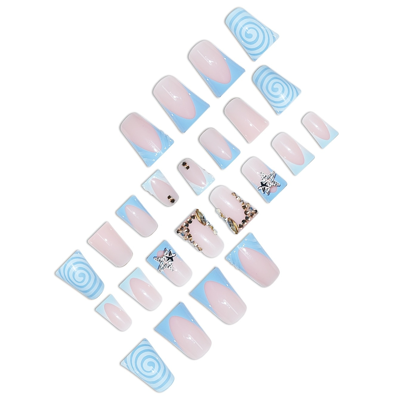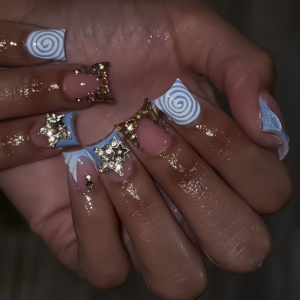 跨境热销蓝色甜酷旋涡纹理爆闪星星闪钻设计穿戴甲假指甲成品批发