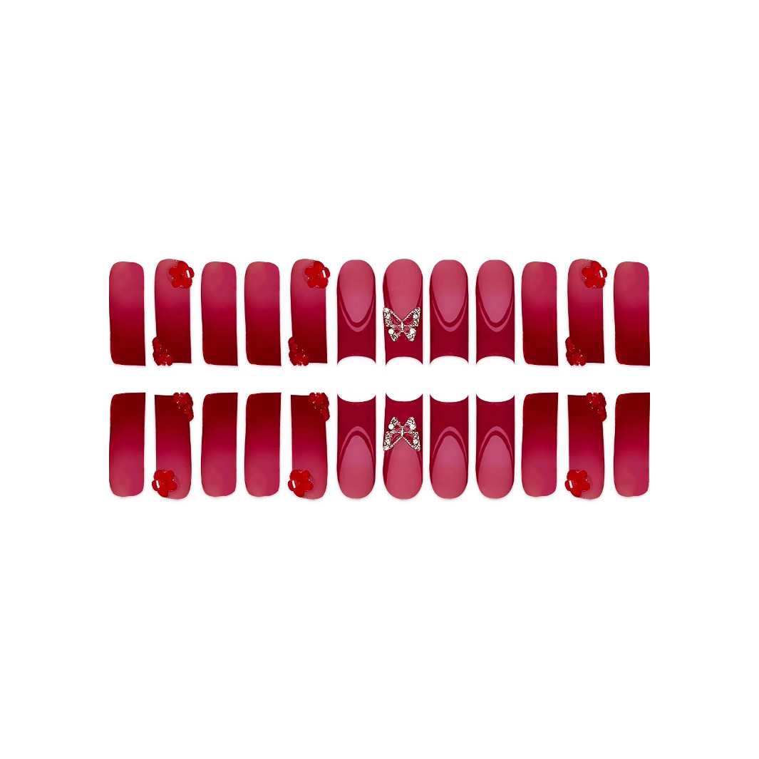 跨境热售欧美血红色法式长水管蝴蝶配饰钻饰可拆卸穿戴甲成品批发