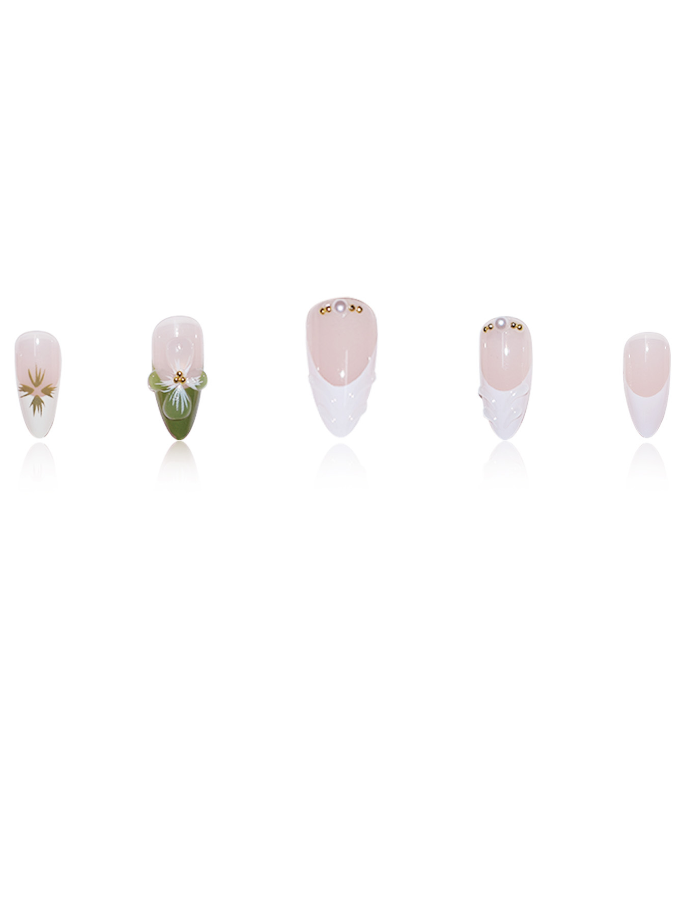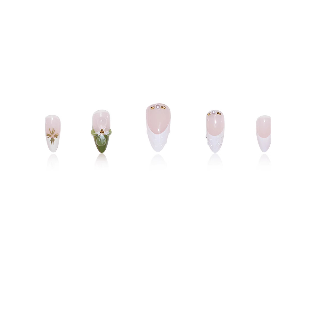 跨境热售杏仁型假指甲白绿色法式立体波纹茶花小金珠百搭气质温柔 English | 投诉