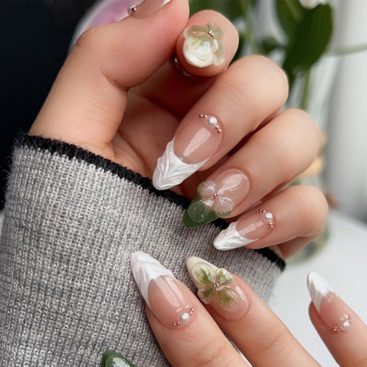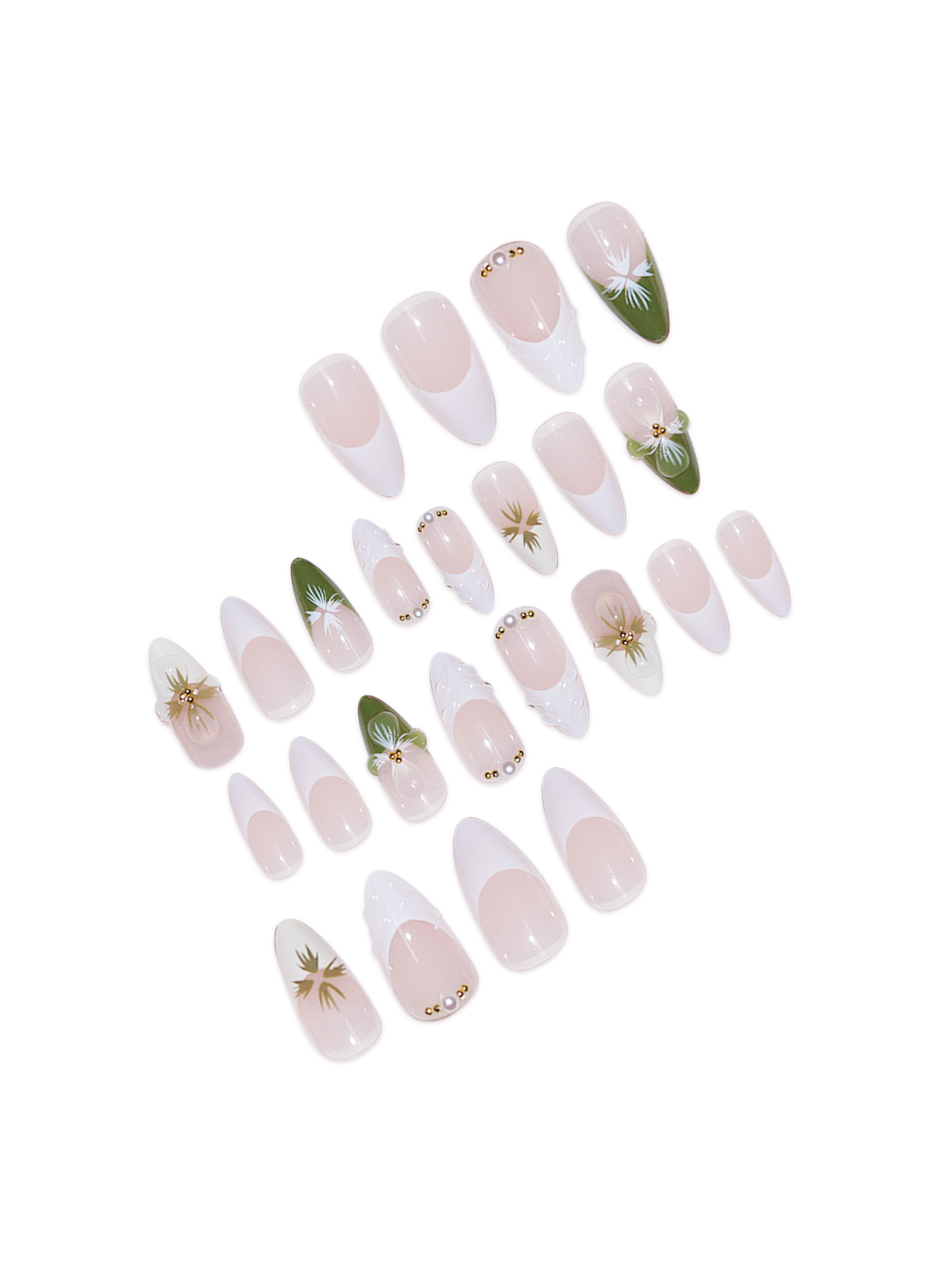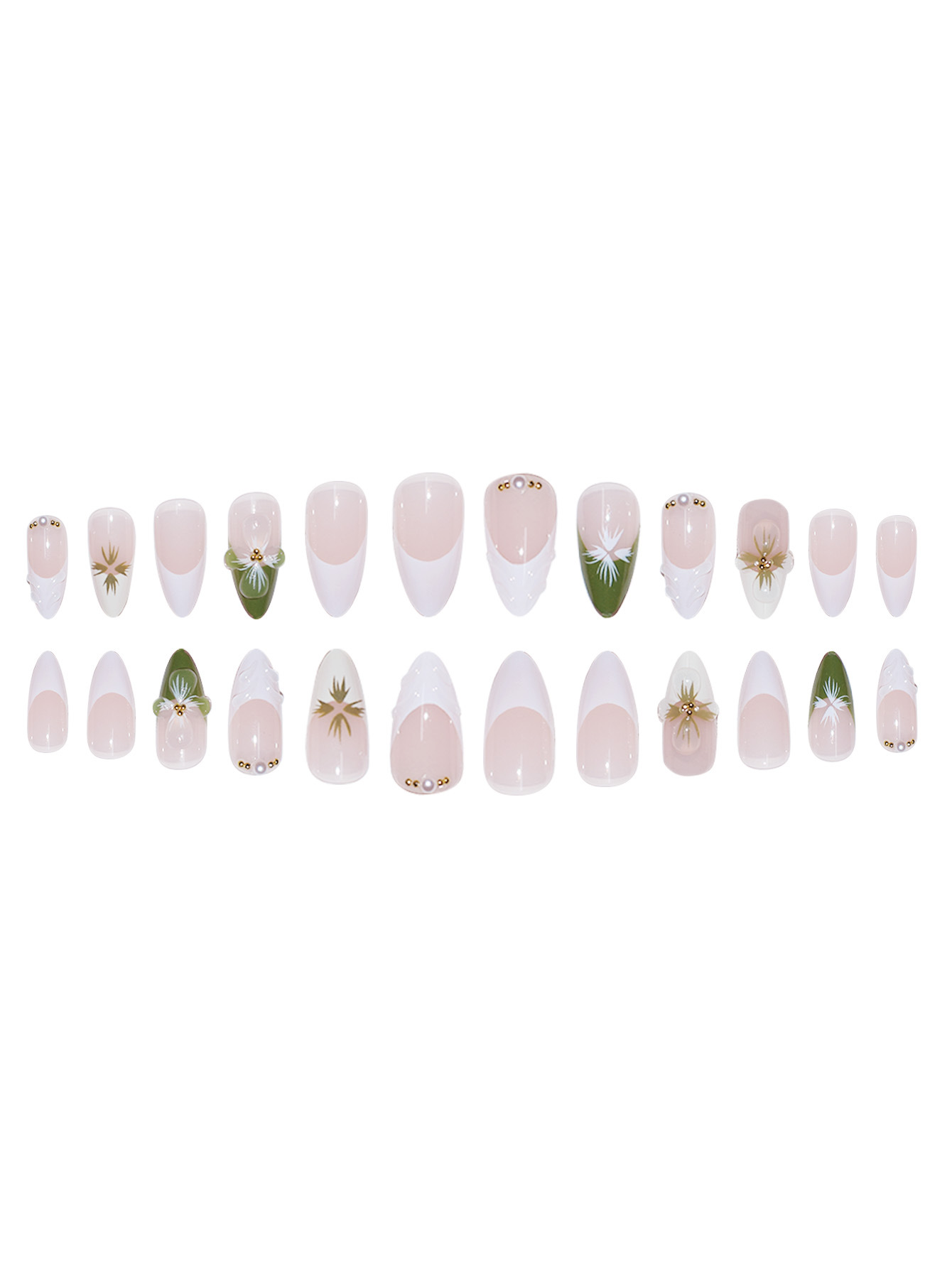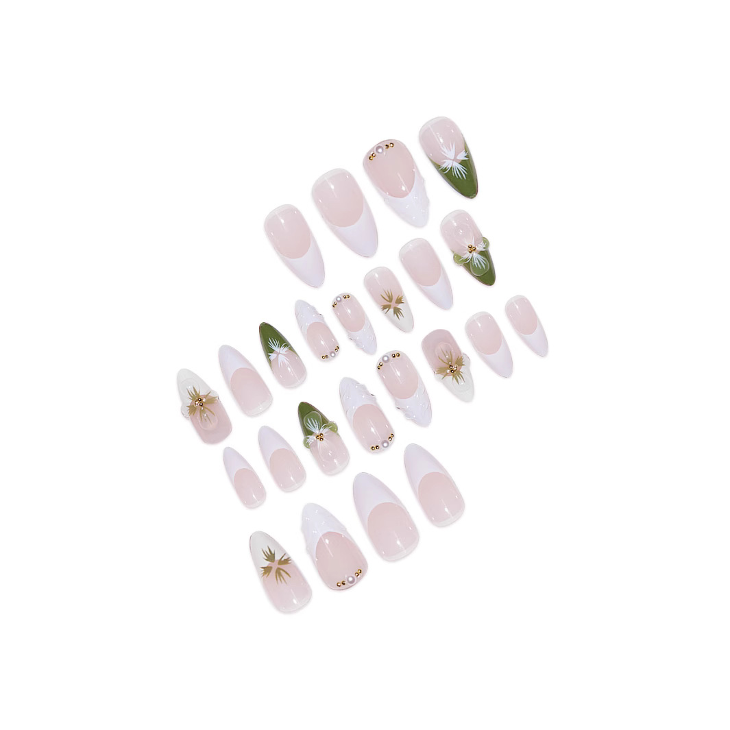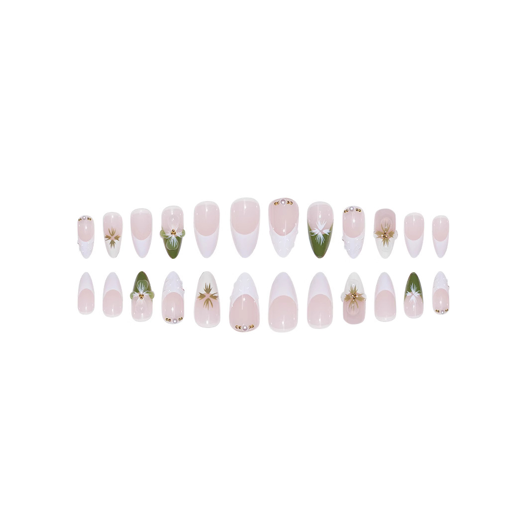 跨境热售杏仁型假指甲白绿色法式立体波纹茶花小金珠百搭气质温柔