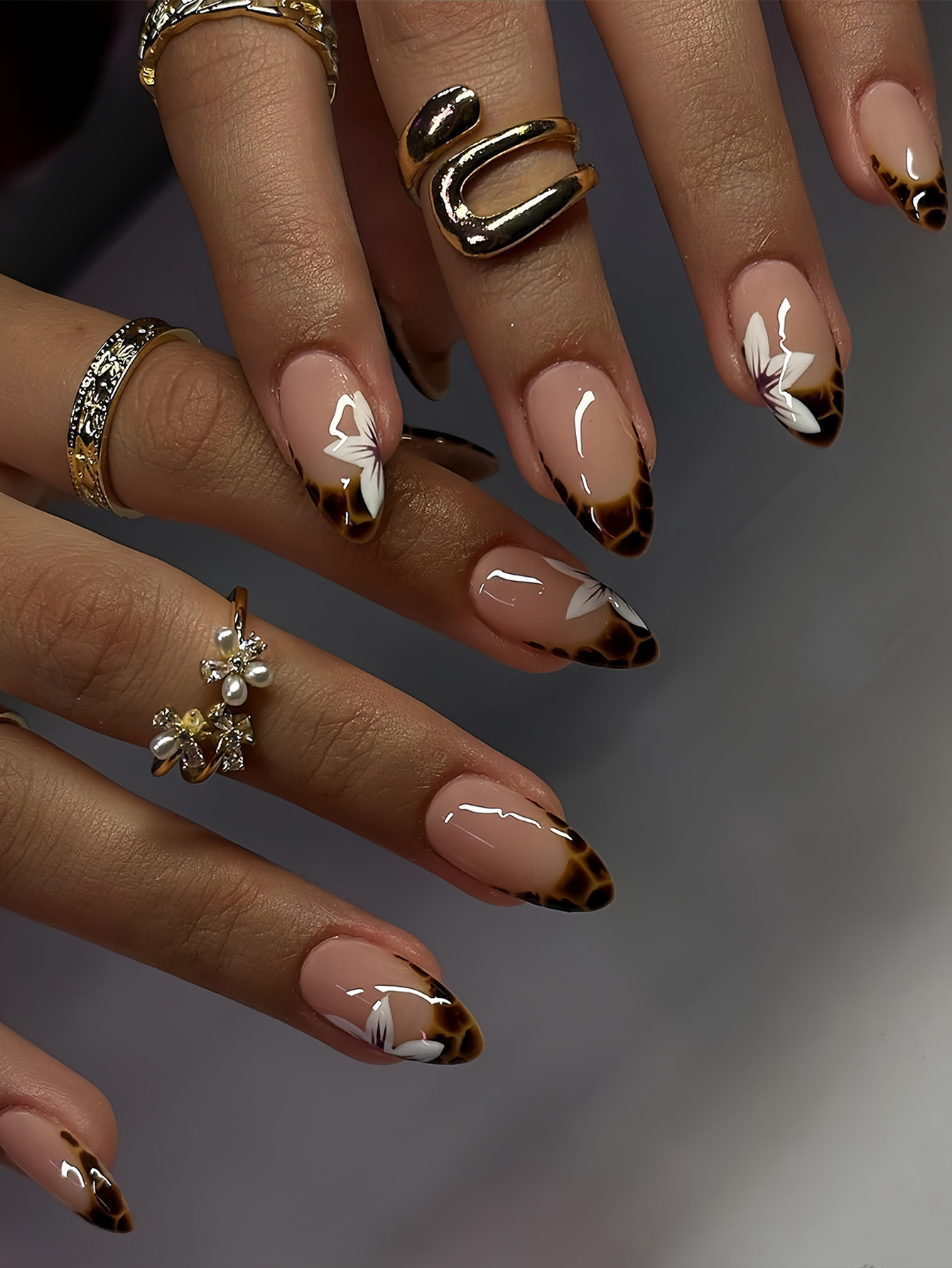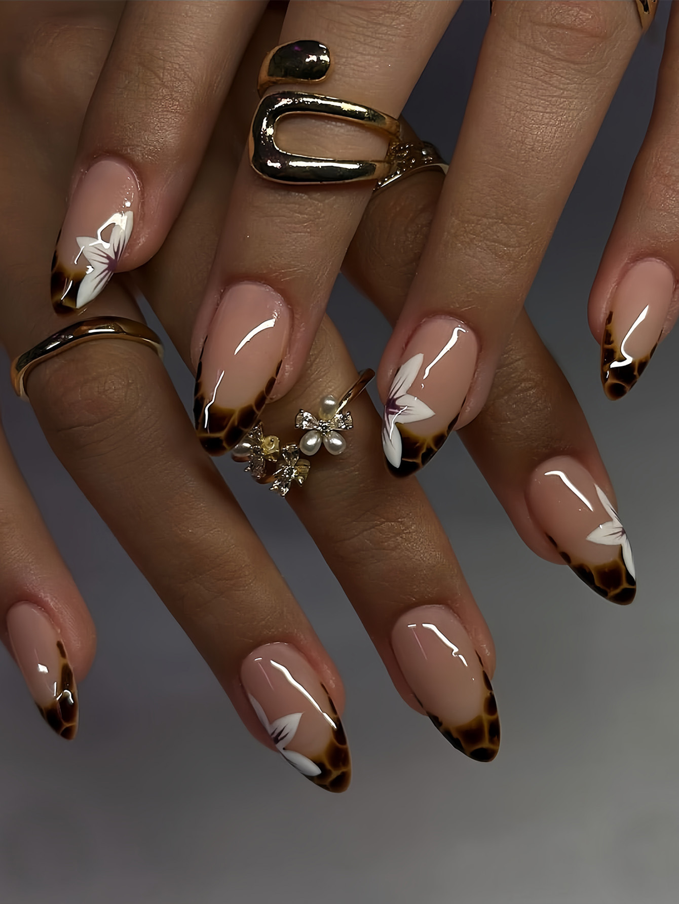 跨境热销欧美穿戴甲甜酷花朵豹纹可拆卸杏仁型短款假指甲成品批发