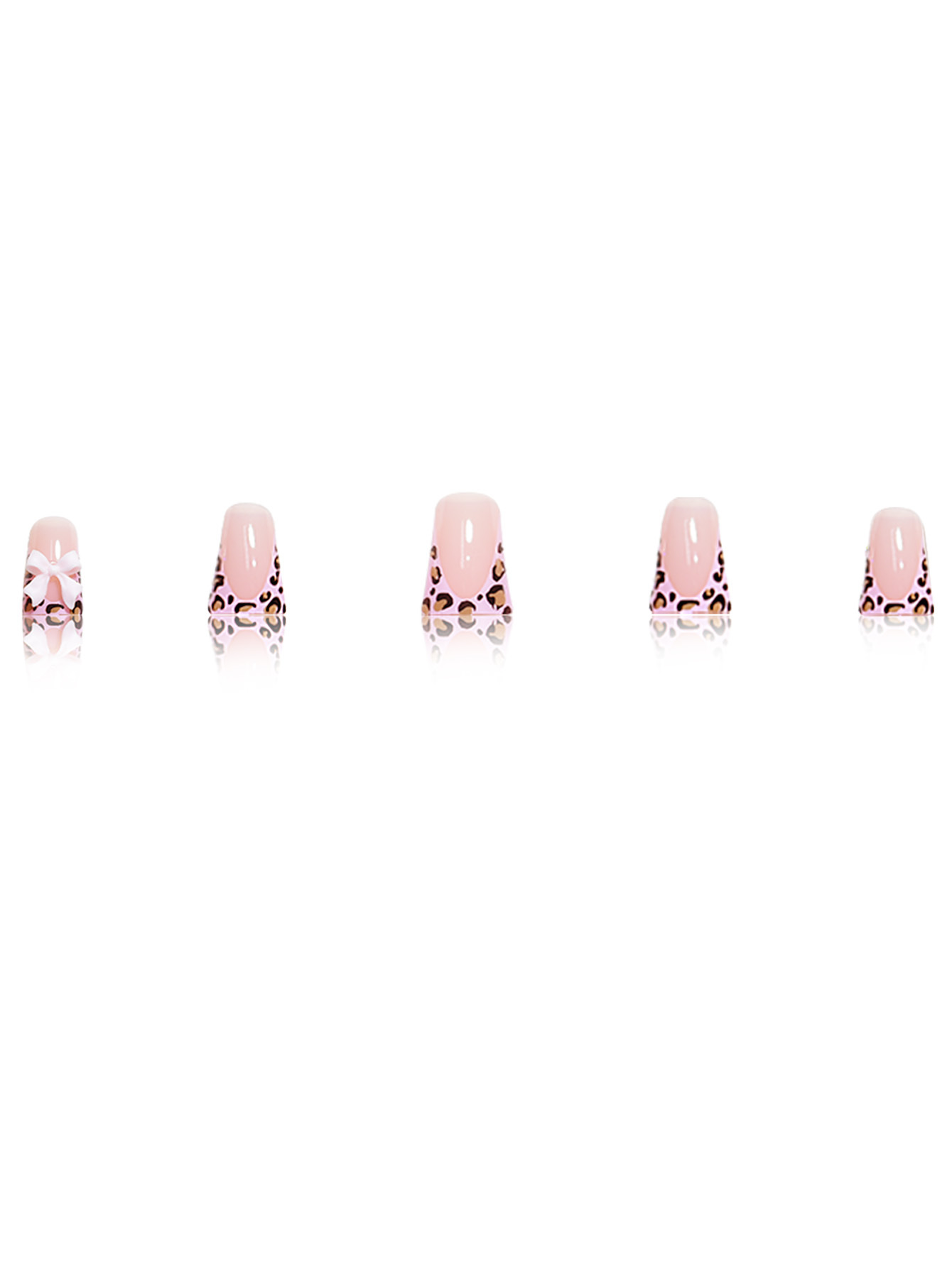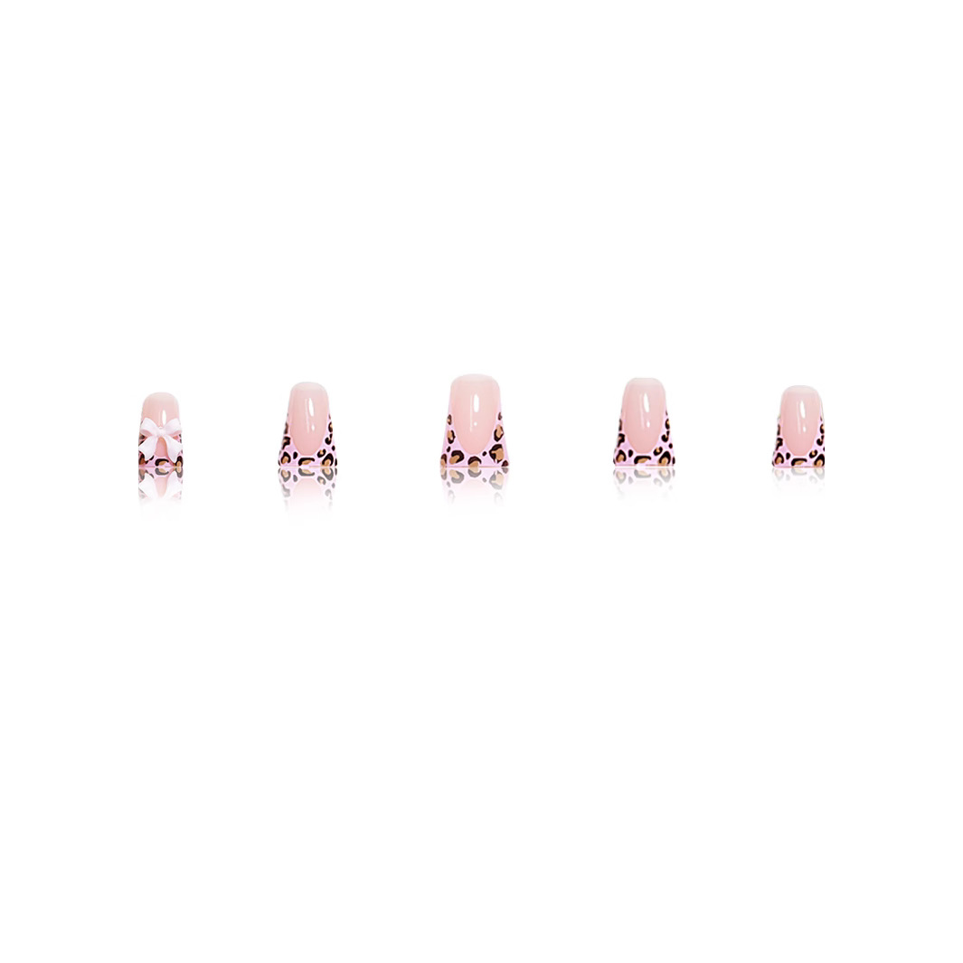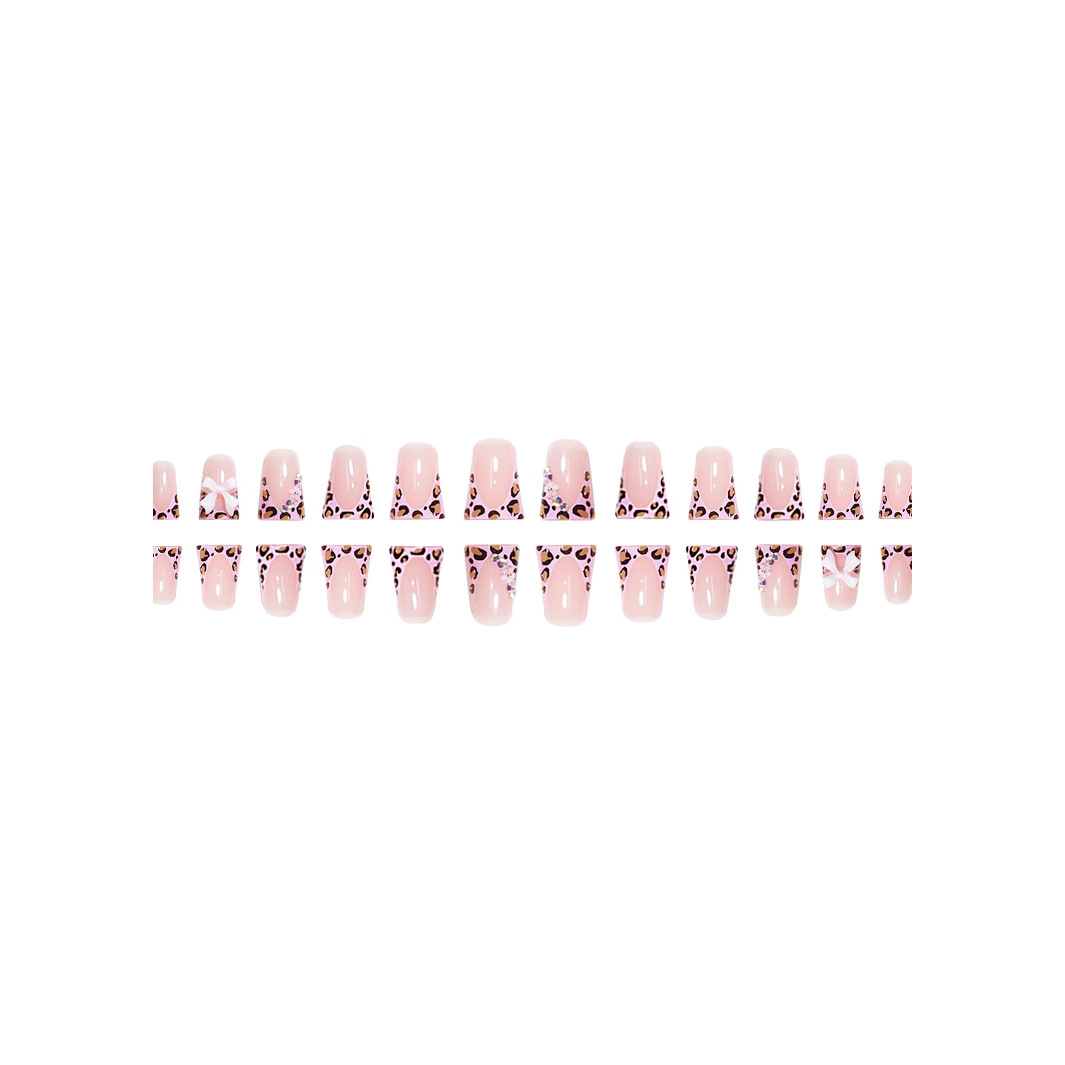 短款亮面欧美跨境外贸粉色豹纹粉色蝴蝶结穿戴甲假指甲可拆卸24片