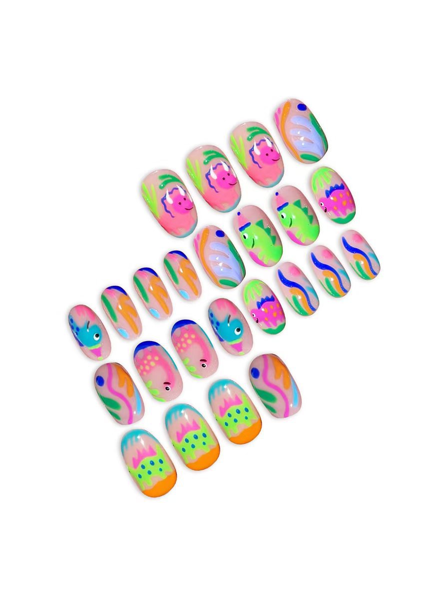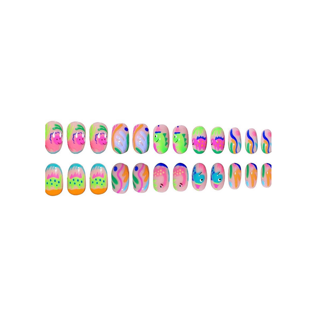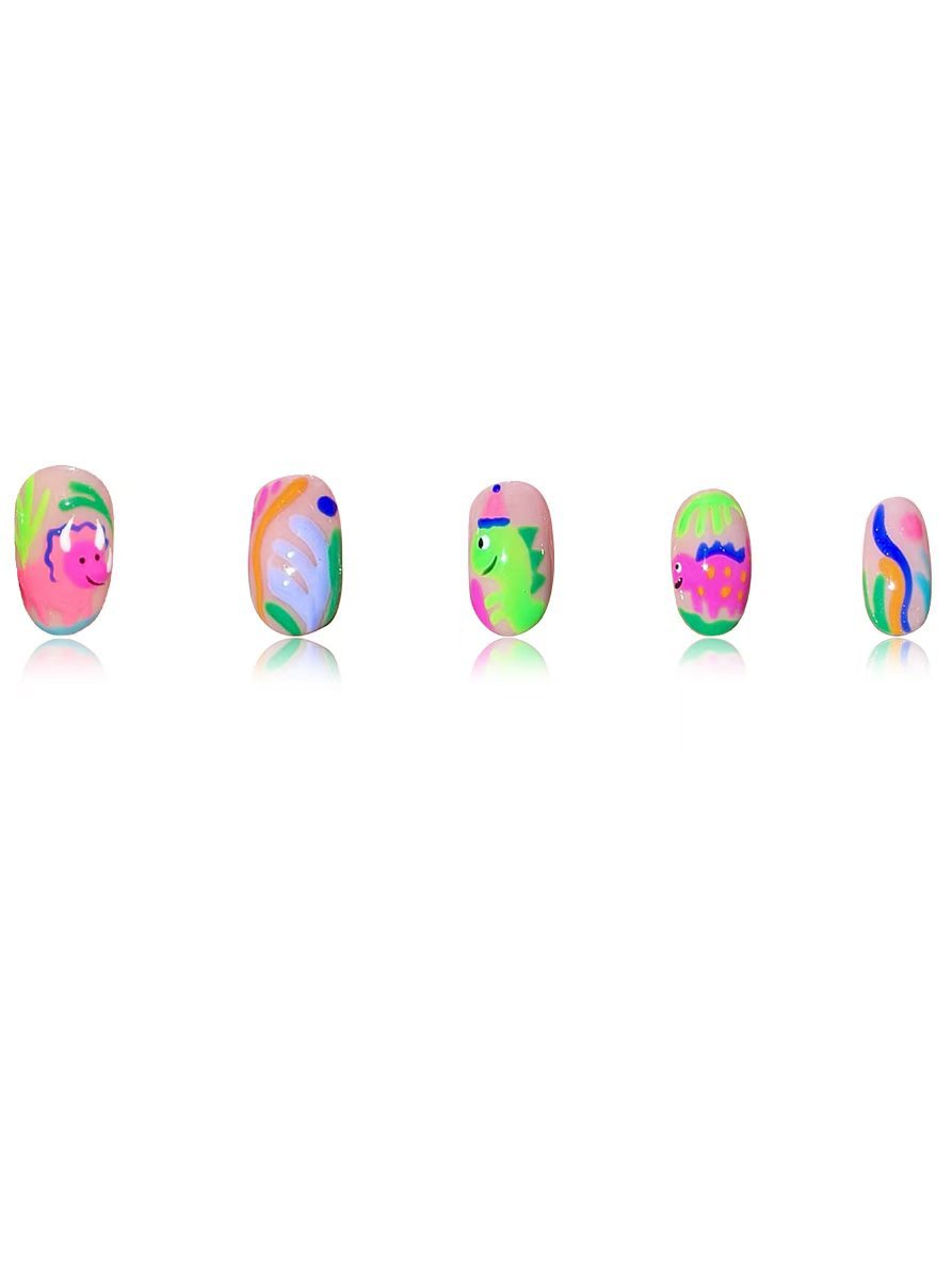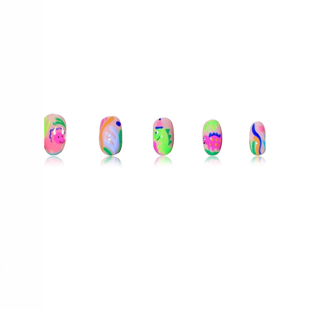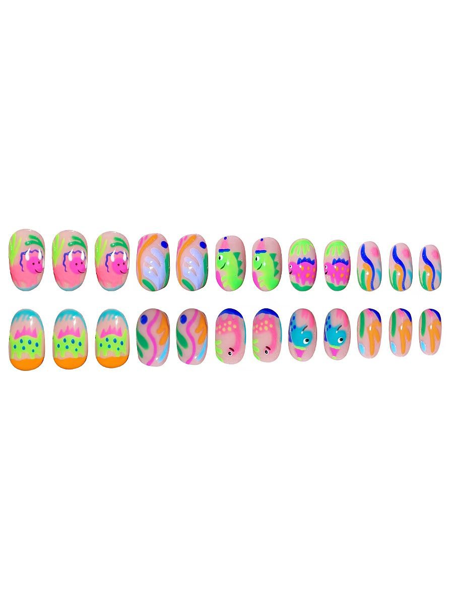 跨境热售款椭圆形美甲卡通可爱涂鸦彩色恐龙可拆卸假指甲成品批发 English | 投诉