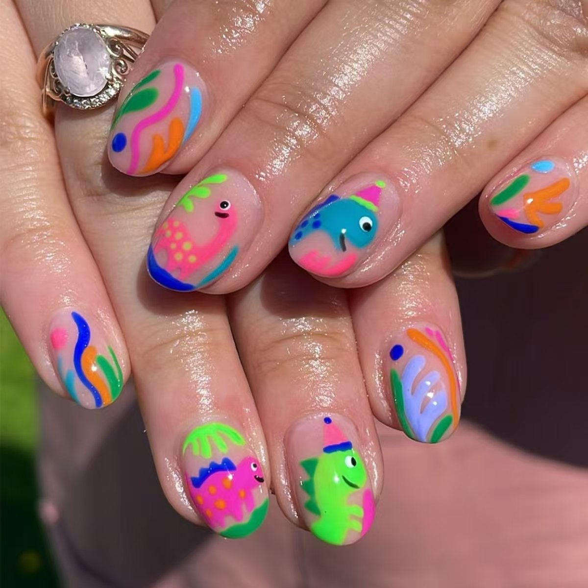 跨境热售款椭圆形美甲卡通可爱涂鸦彩色恐龙可拆卸假指甲成品批发