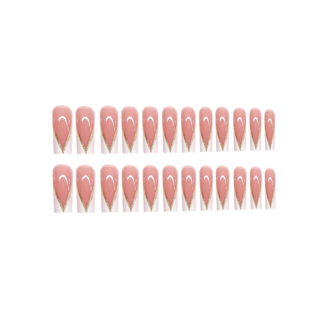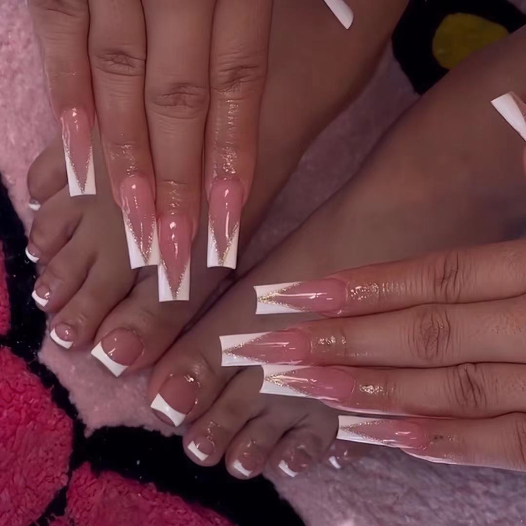 跨境热售手甲套装法式白边裸色长款穿戴甲可拆卸假指甲成品批发