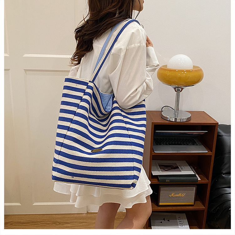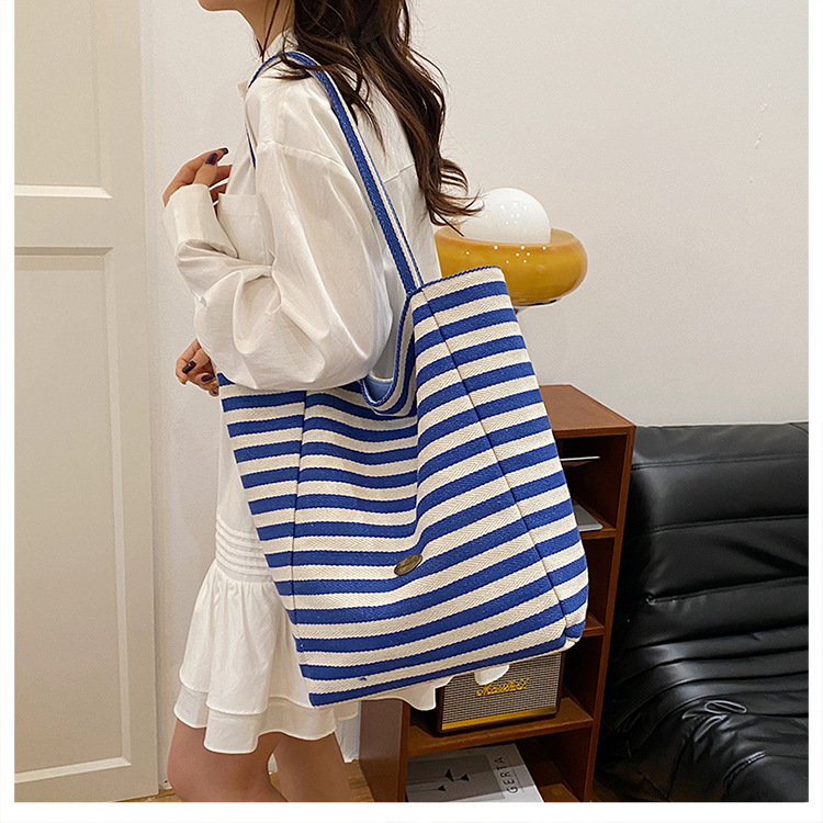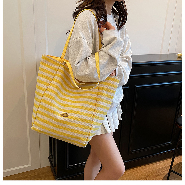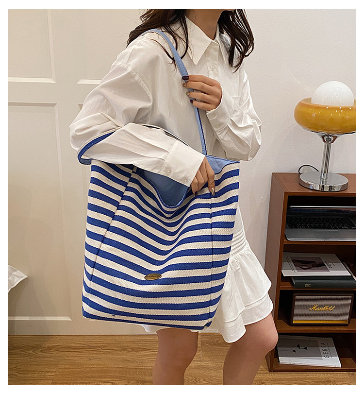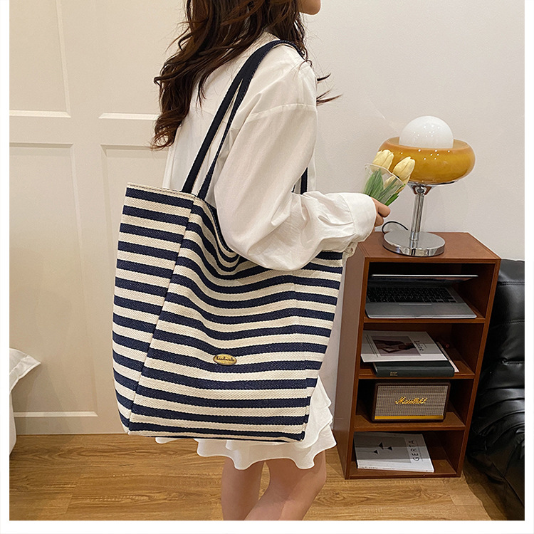 条纹帆布双面可用包新款慵懒风托特包休闲单肩大容量托特包购
