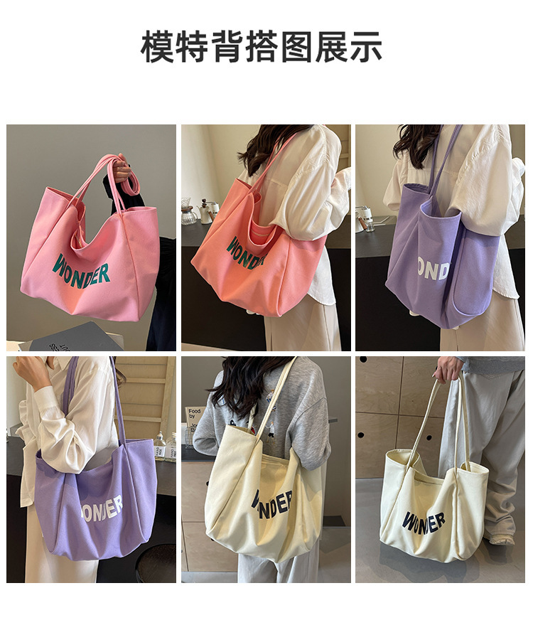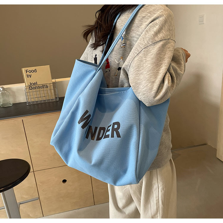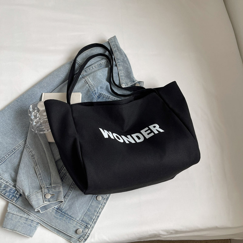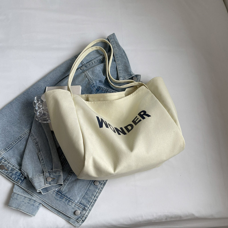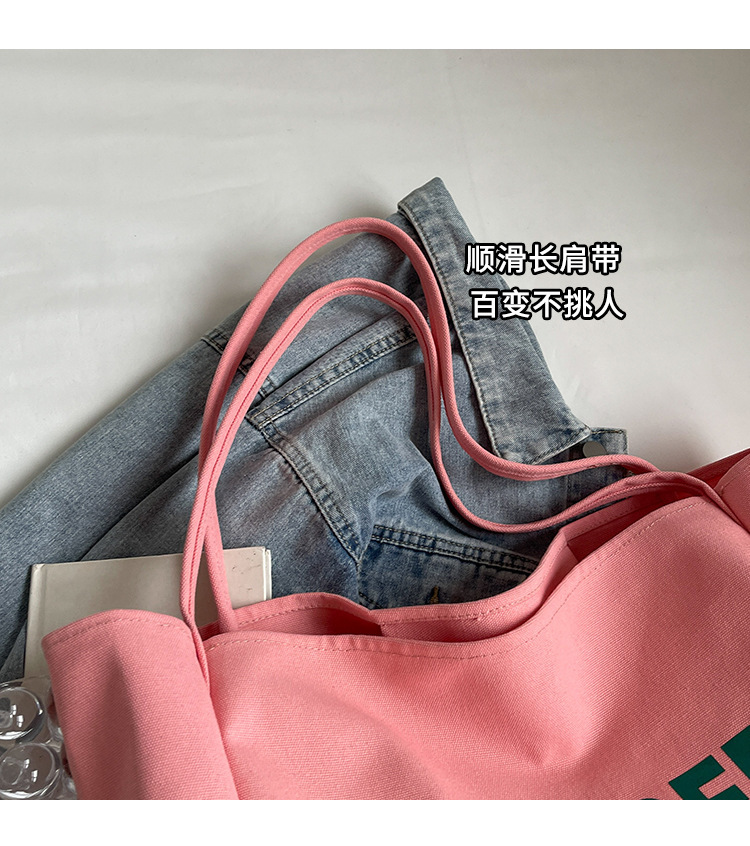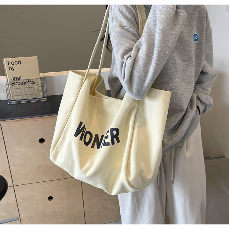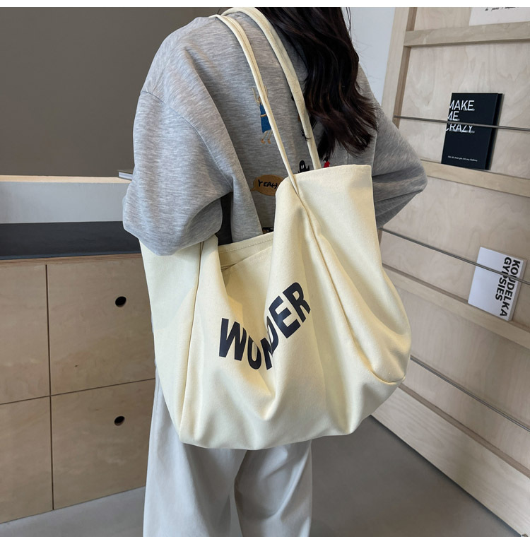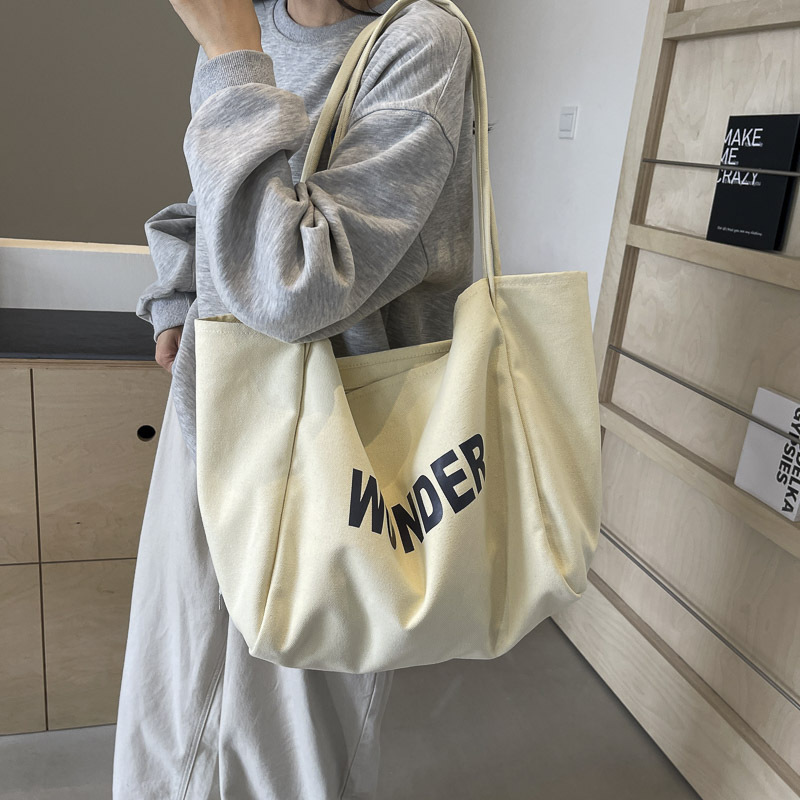 韩版慵懒风包手提背包夏季新款帆布字母印花大容量简约单肩包 English | 投诉