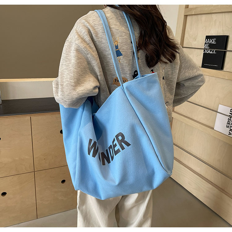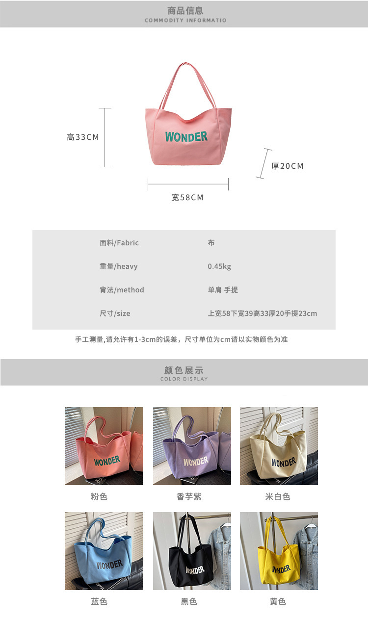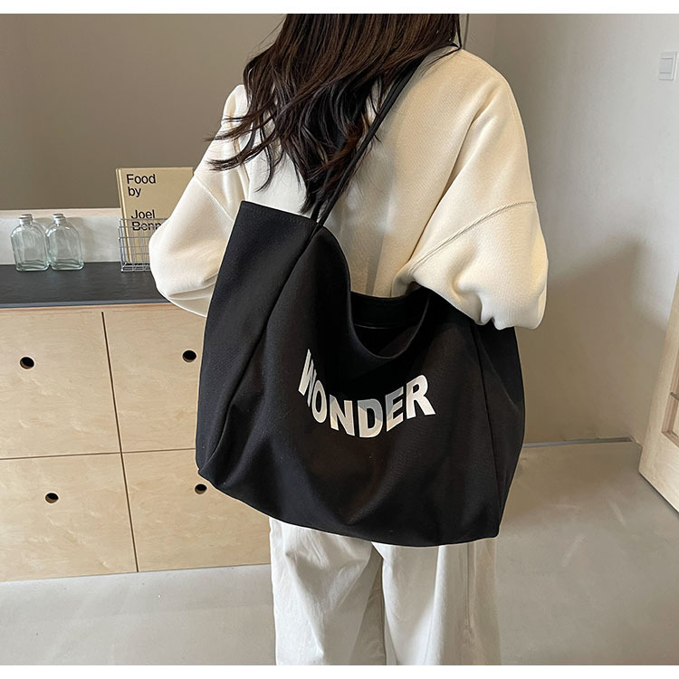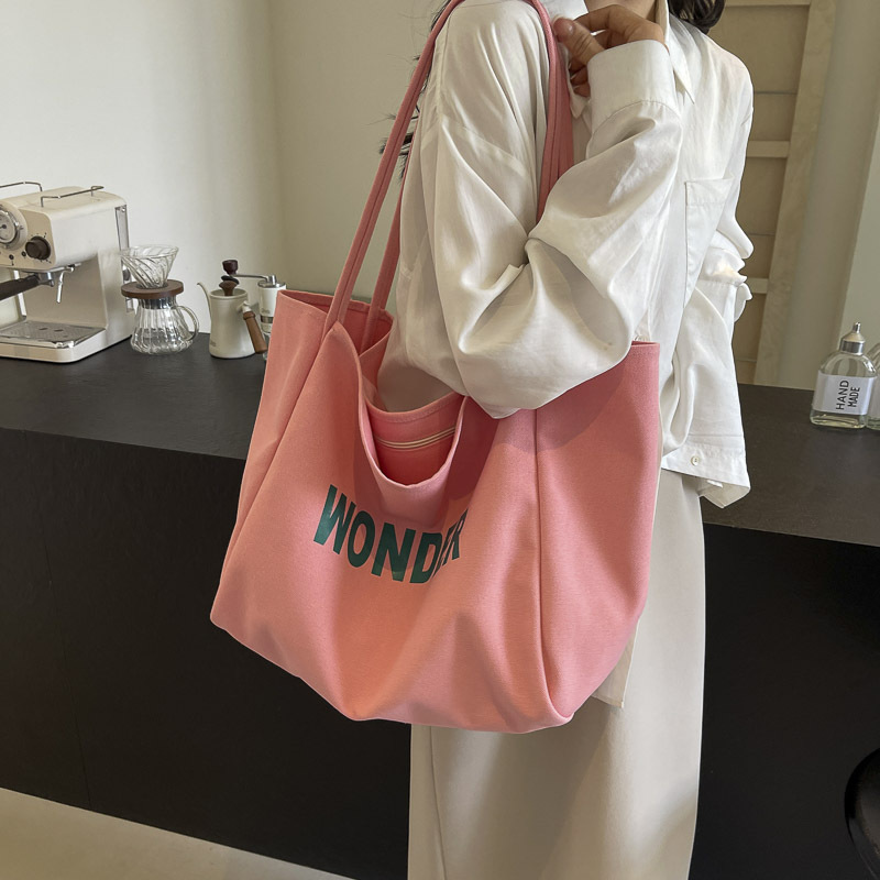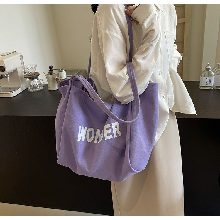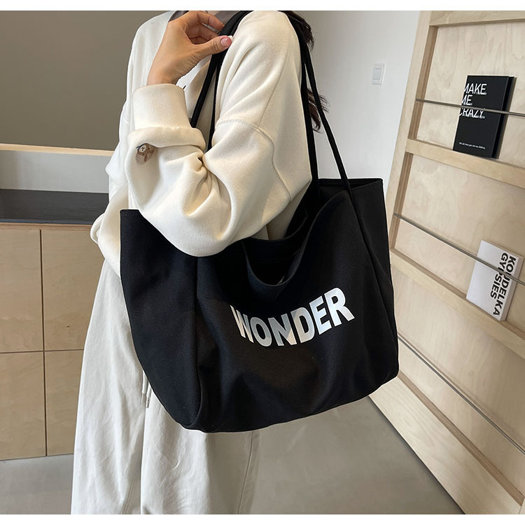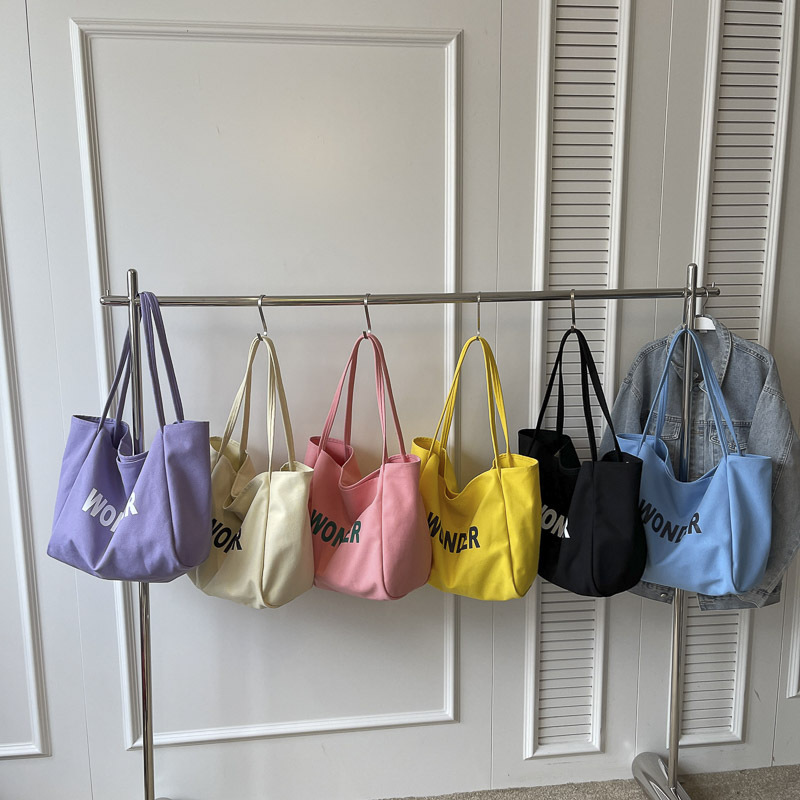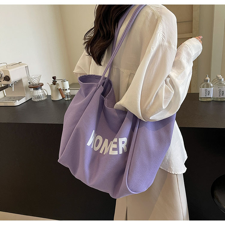 韩版慵懒风包手提背包夏季新款帆布字母印花大容量简约单肩包 English | 投诉