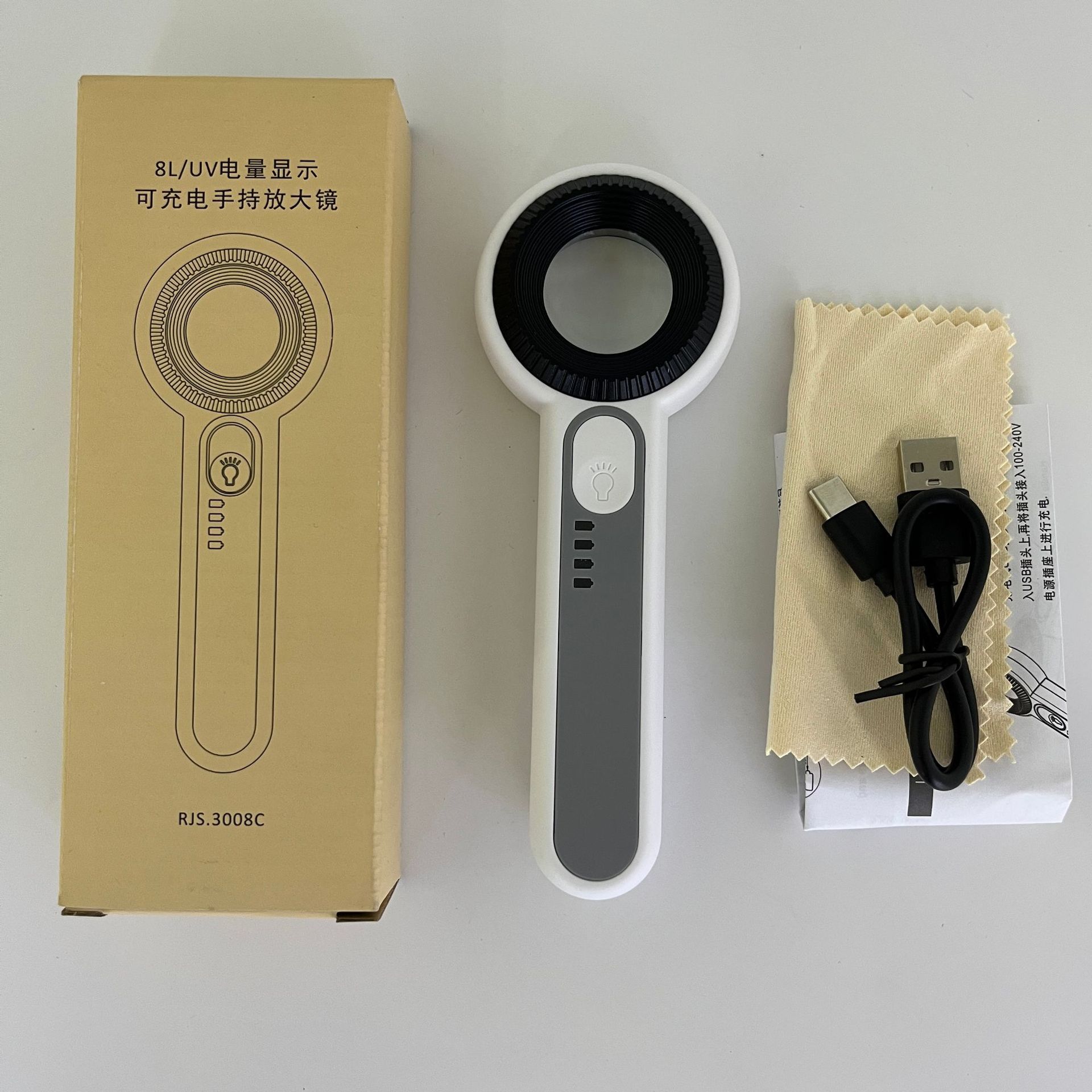产品包装:彩盒+opp袋+擦镜布+中英文说明书+USB充电线
