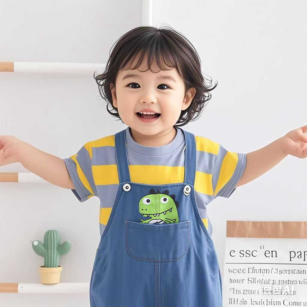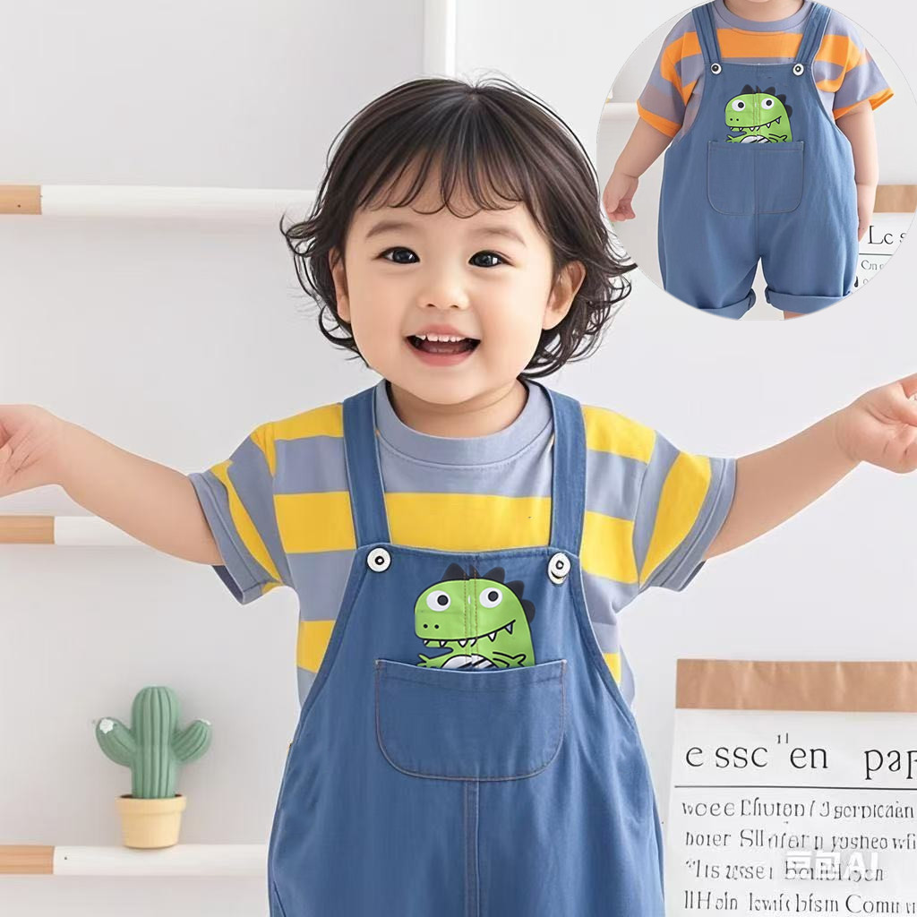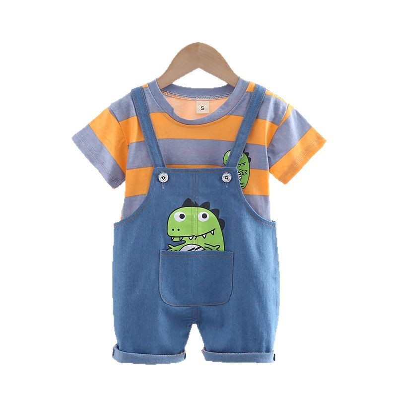 儿童帅气牛仔背带裤套装男童韩版短袖两件套小童条纹恐龙宝宝潮款