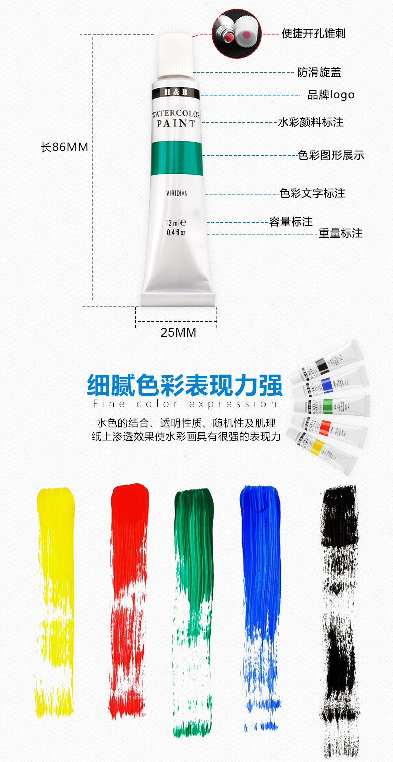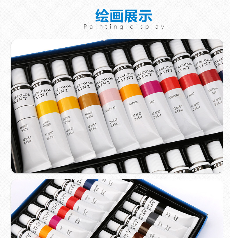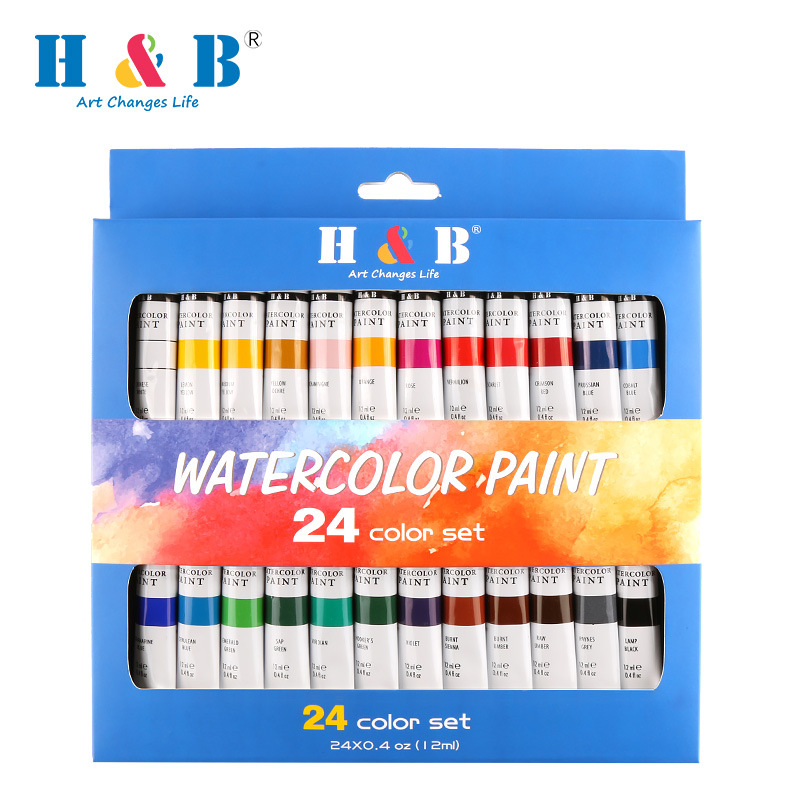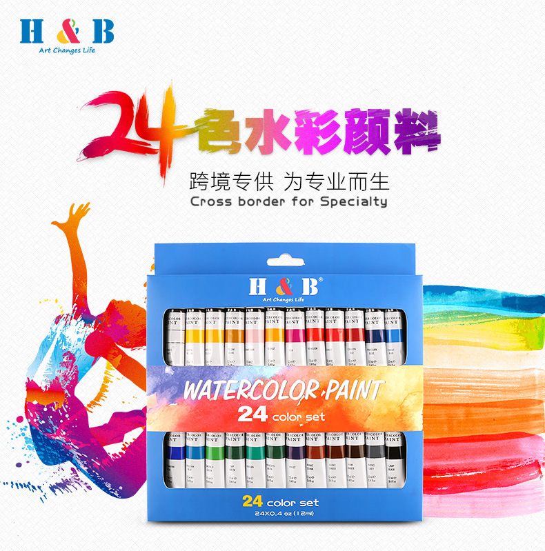 品牌: H&B 材质: 水彩颜料 是否进口: 否 货号: HB-WP24B 容量: 12ml 包装: 24色一盒 用途: 水彩画 主要销售地区: 欧洲,南美,东南亚,北美 有可授权的自有品牌: 是 是否跨境出口专供货源: 是 重量: 0.5 kg/件