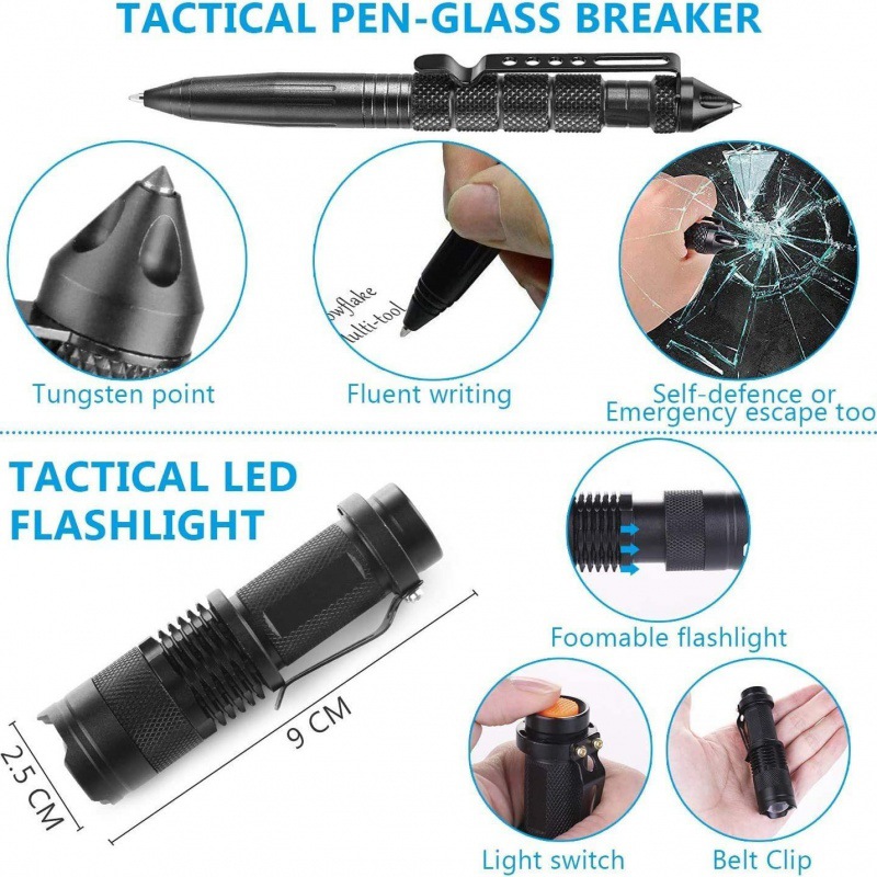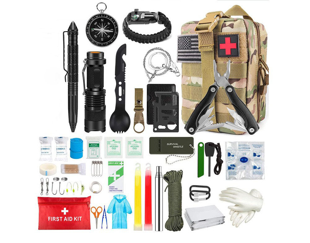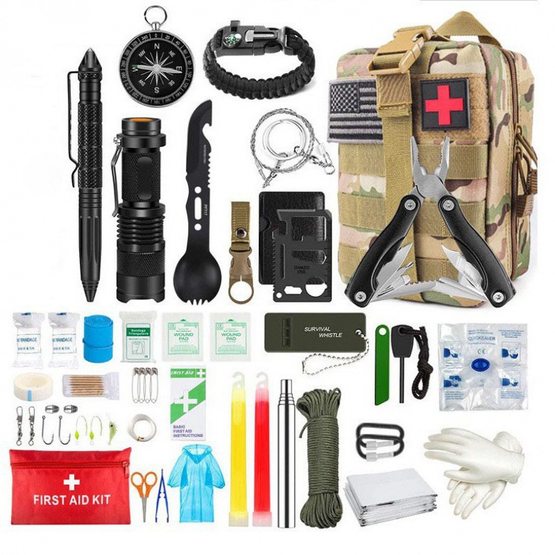 强光手电筒*1;折叠钳子*1 ;口哨刀*1;水瓶扣*1;伞绳*1;荧光棒*1;吹风管*1;战术笔*1;多功能工具卡*1;打火石*1;求生口哨*1;求生手链*1;PVC手套*1;雨衣*1;指南针*1;急救面罩*1;急救毯*1
