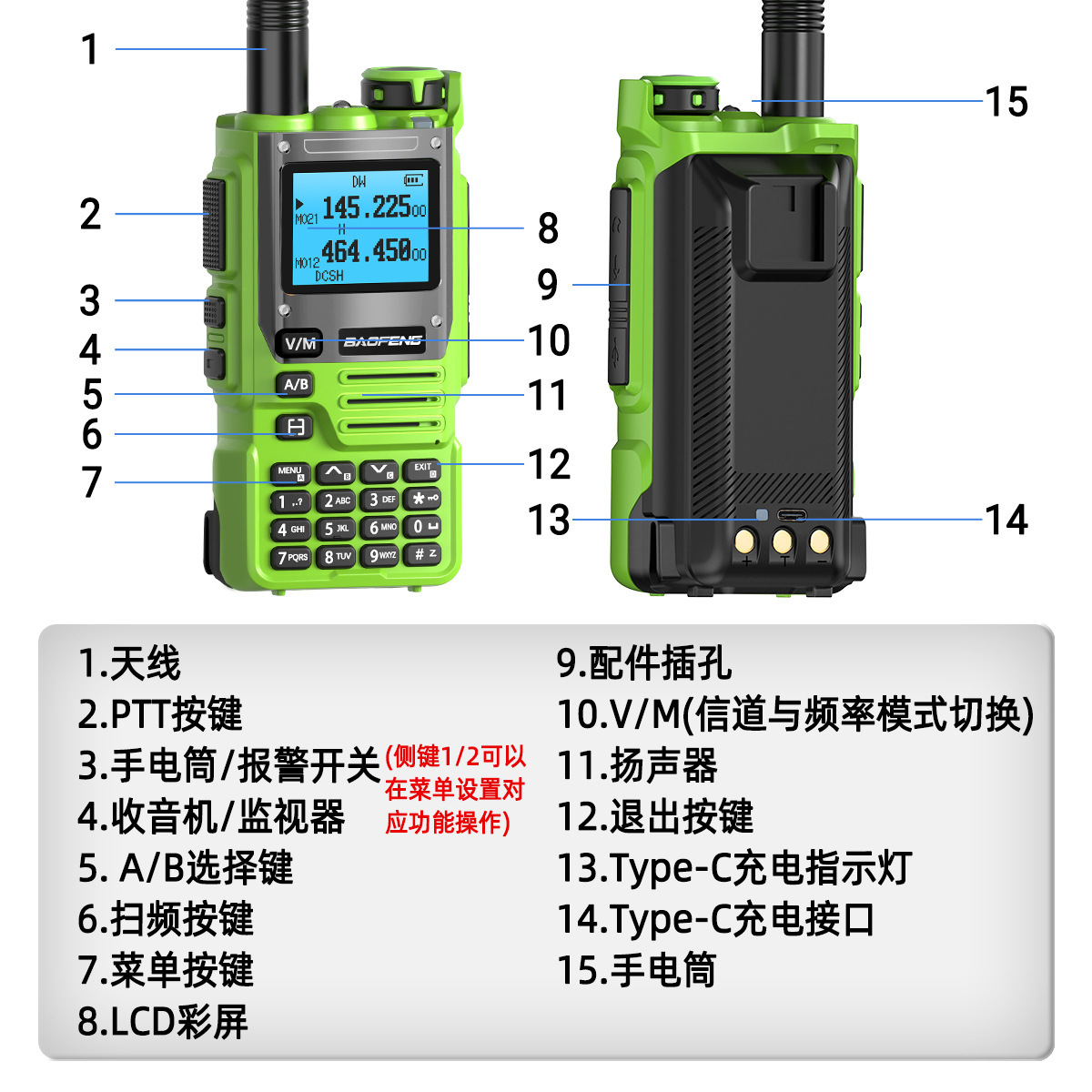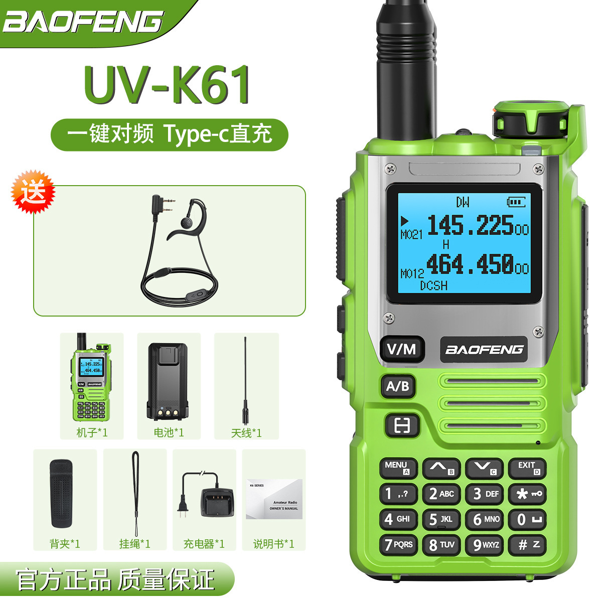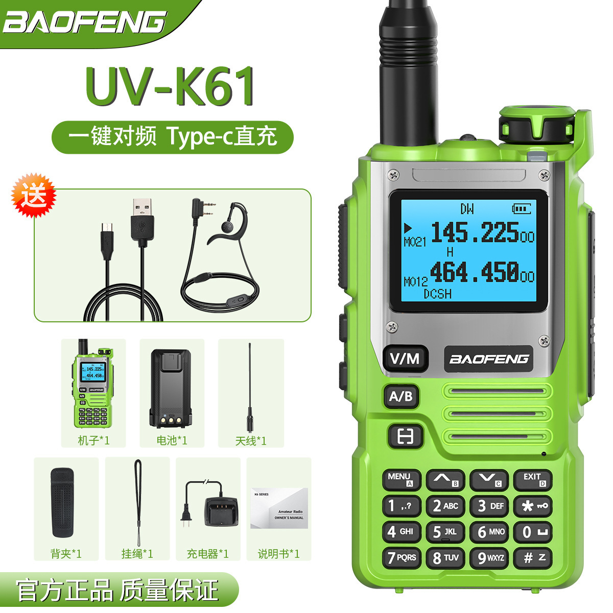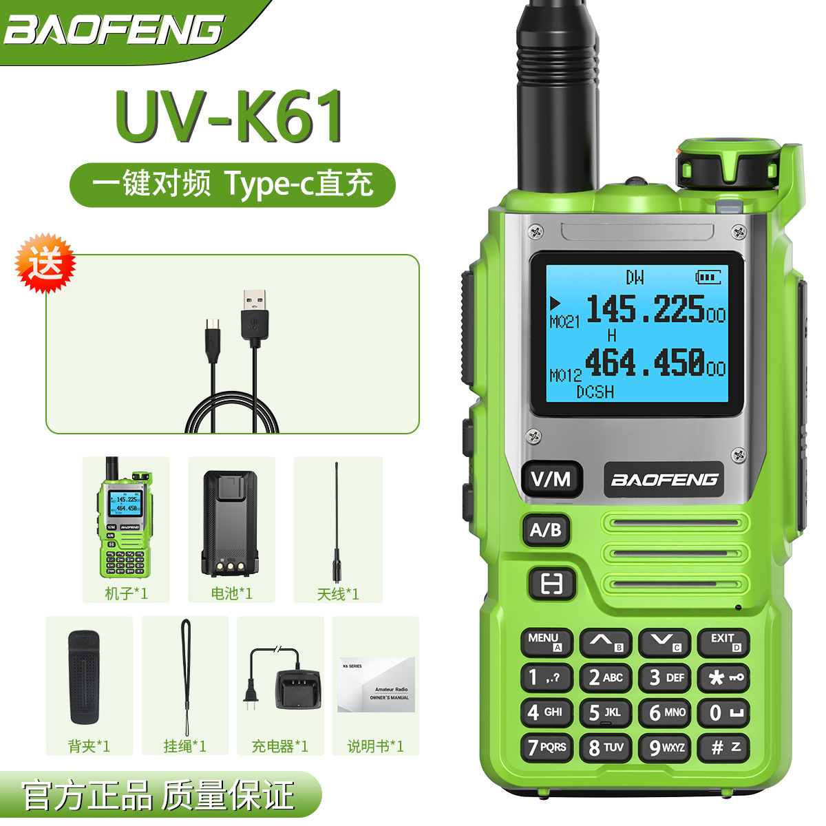种类: 整机 货号: UV-K61 品牌: 其他 频率范围: 全频段 射频输出功率: 5W 信道数: 999 理论通讯距离: 5km-10km 电池类型: 锂电池 颜色: 绿色标配【下单请备注 欧规/美规/中文】 风格: 户外自驾游外贸