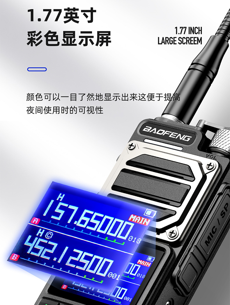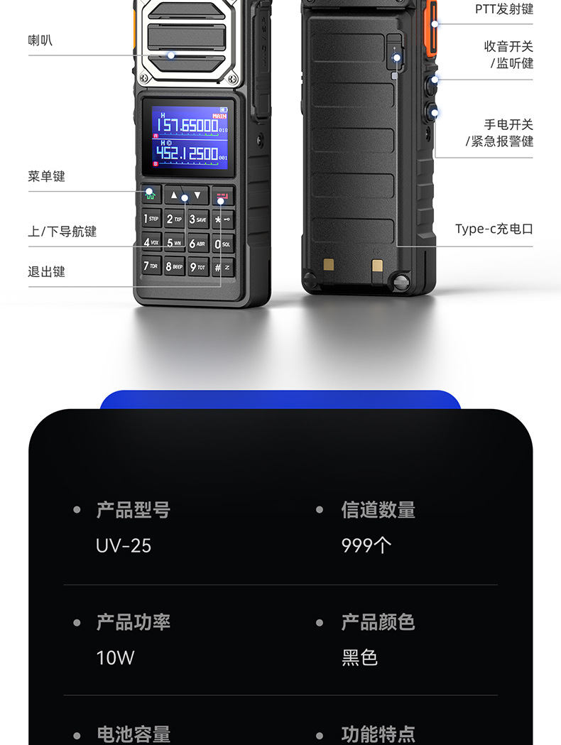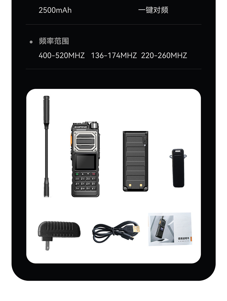 种类: 整机 货号: UV-25L 品牌: 宝锋 频率范围: 136-174/220-260/400- 射频输出功率: 10W(W)W 信道数: 999(个)个 理论通讯距离: 5km-10km 电池类型: 锂电池 是否专利货源: 否 主要销售地区: 非洲,欧洲,南美,东南亚,北美,东北亚,