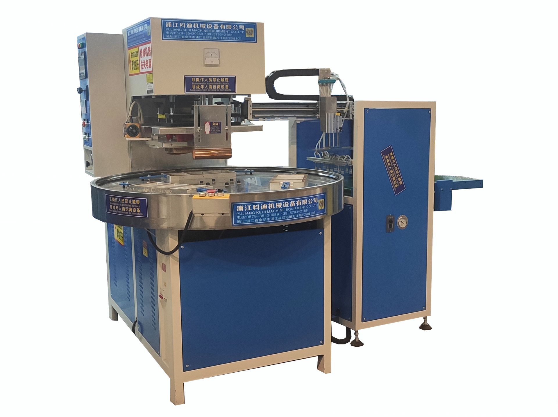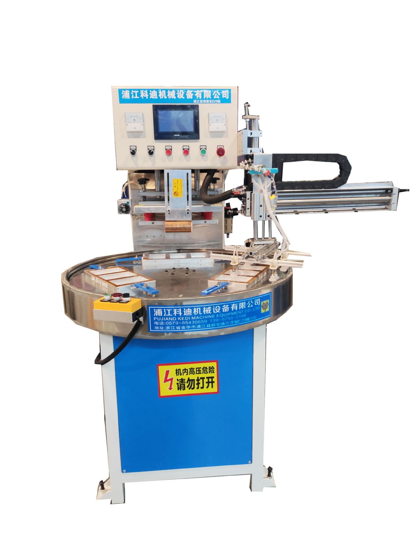 全自动高周波机器本机为全新设计:自动旋转连续工作,全数字控温方式。高强度结构设计:刚性强,移动方便。采用高精度分度盘定位,带有整型工位,操作简单,大大的减低了操作劳动强度,提高效率。