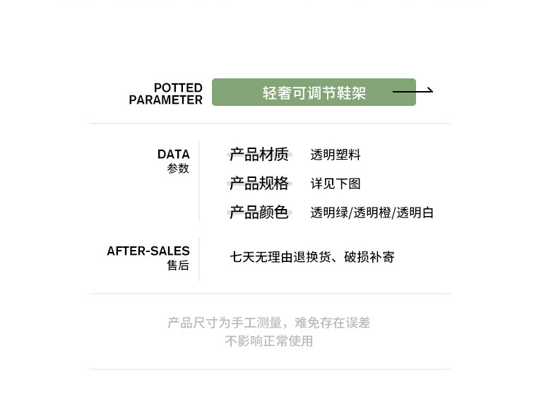 货号: 1 系列: 收纳 产品类别: 收纳 材质: 塑料 型号: 1 具体材质: PET 图案: 纯色 功能: 免安装 商品特性: 可调节