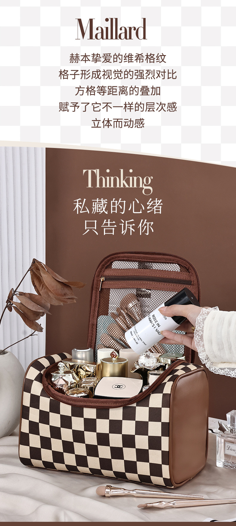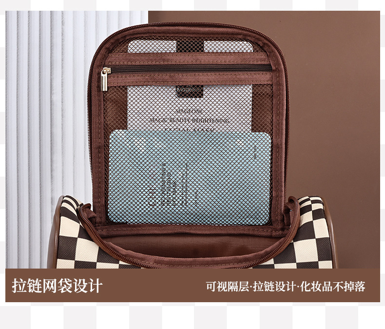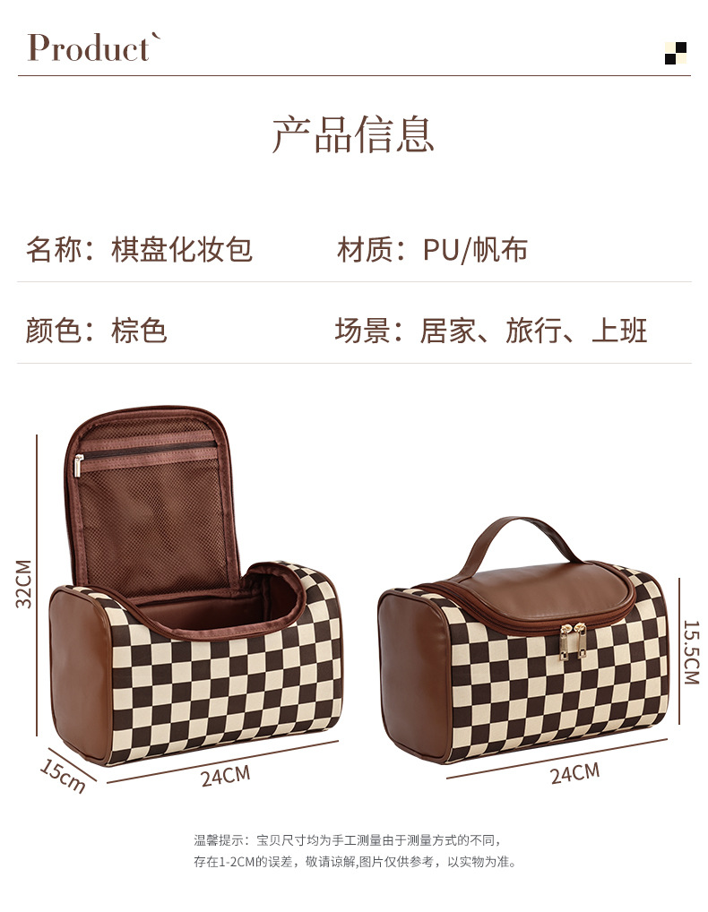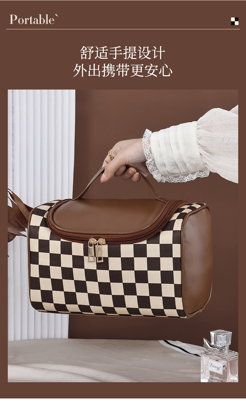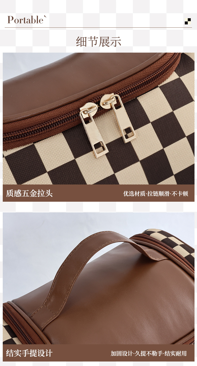 棋盘格洗漱收纳袋美拉德大容量新款复古便携化妆包高颜值收纳手提 投诉