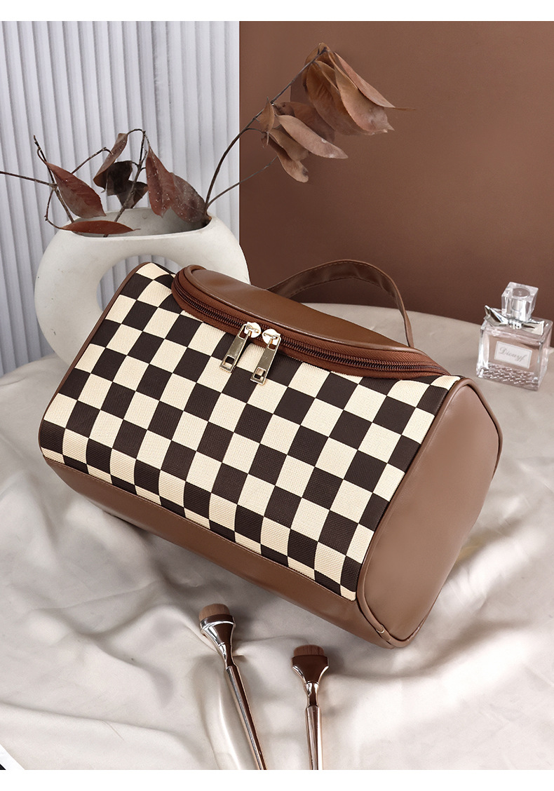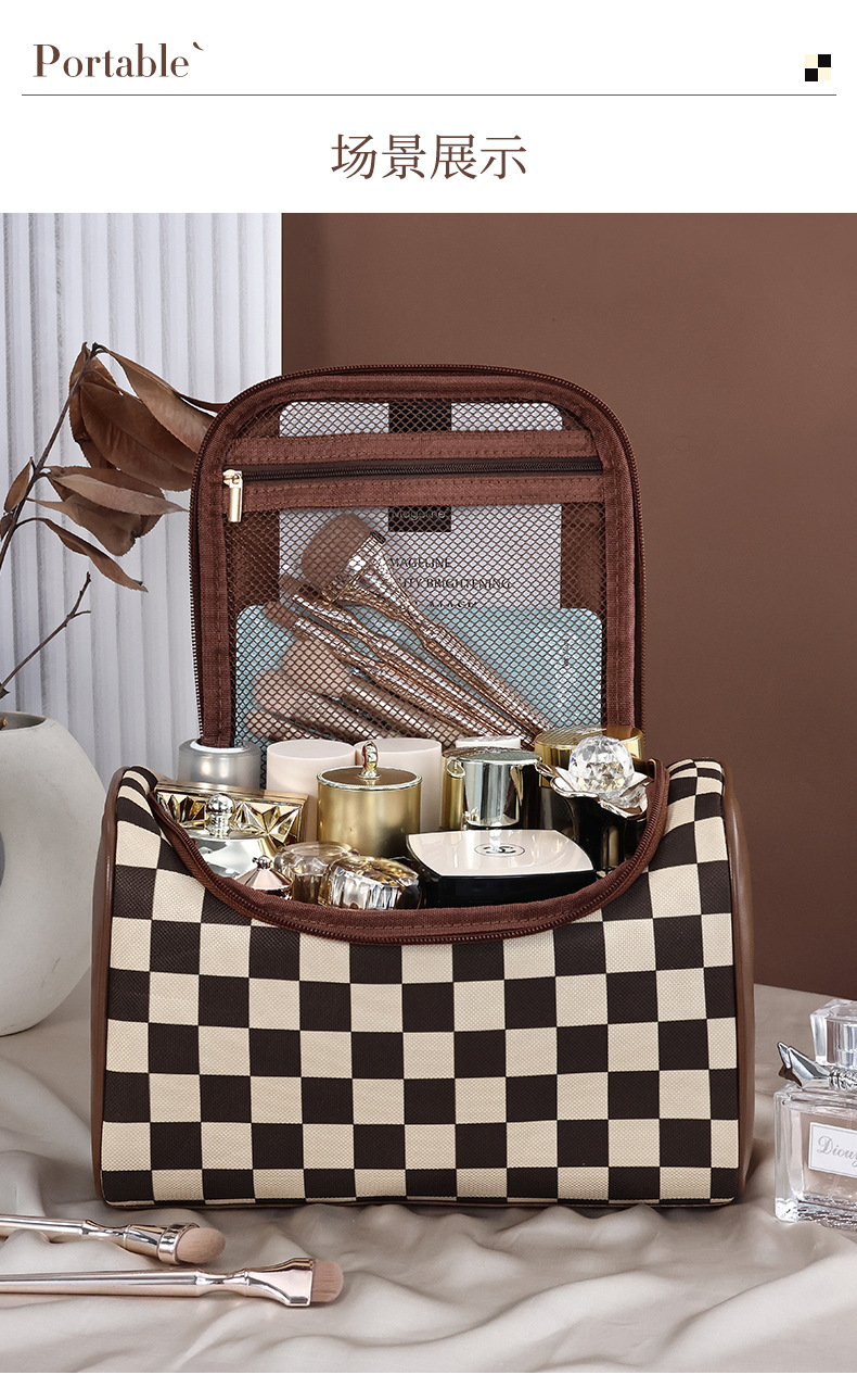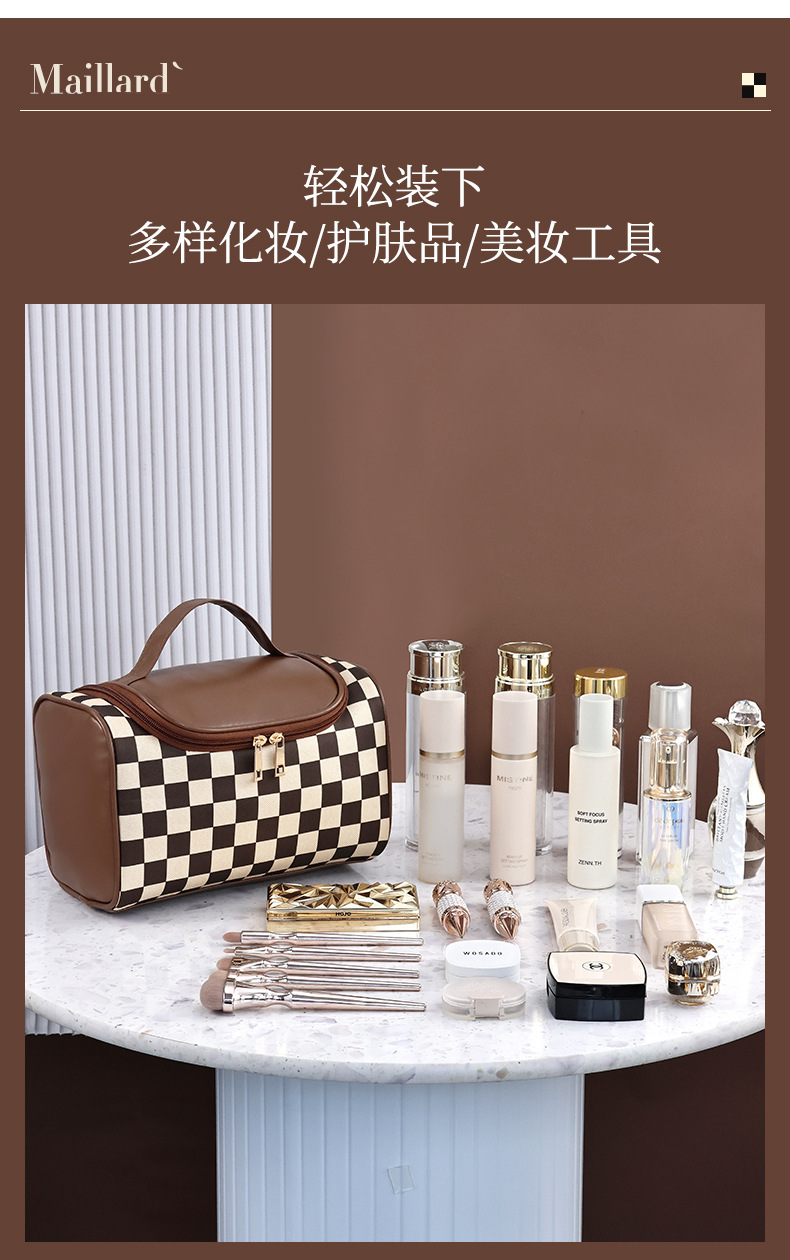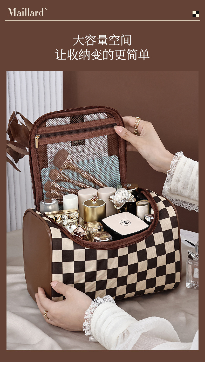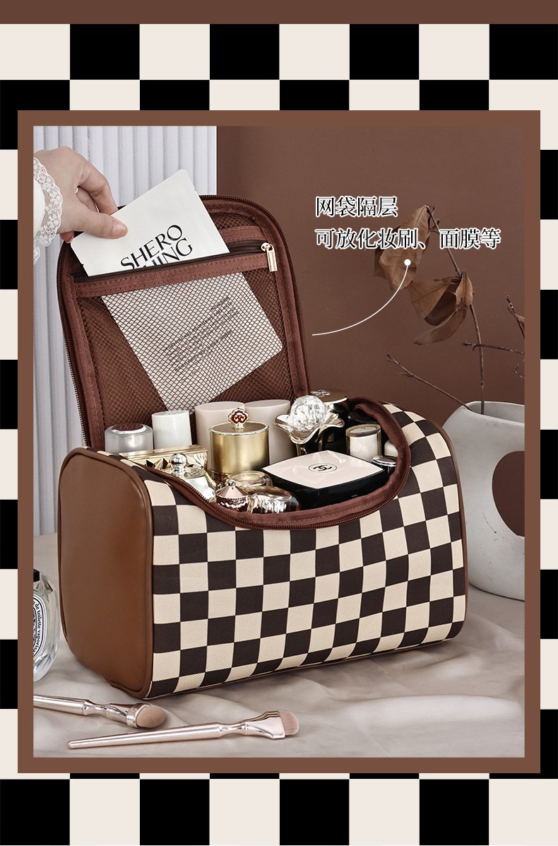 棋盘格洗漱收纳袋美拉德大容量新款复古便携化妆包高颜值收纳手提