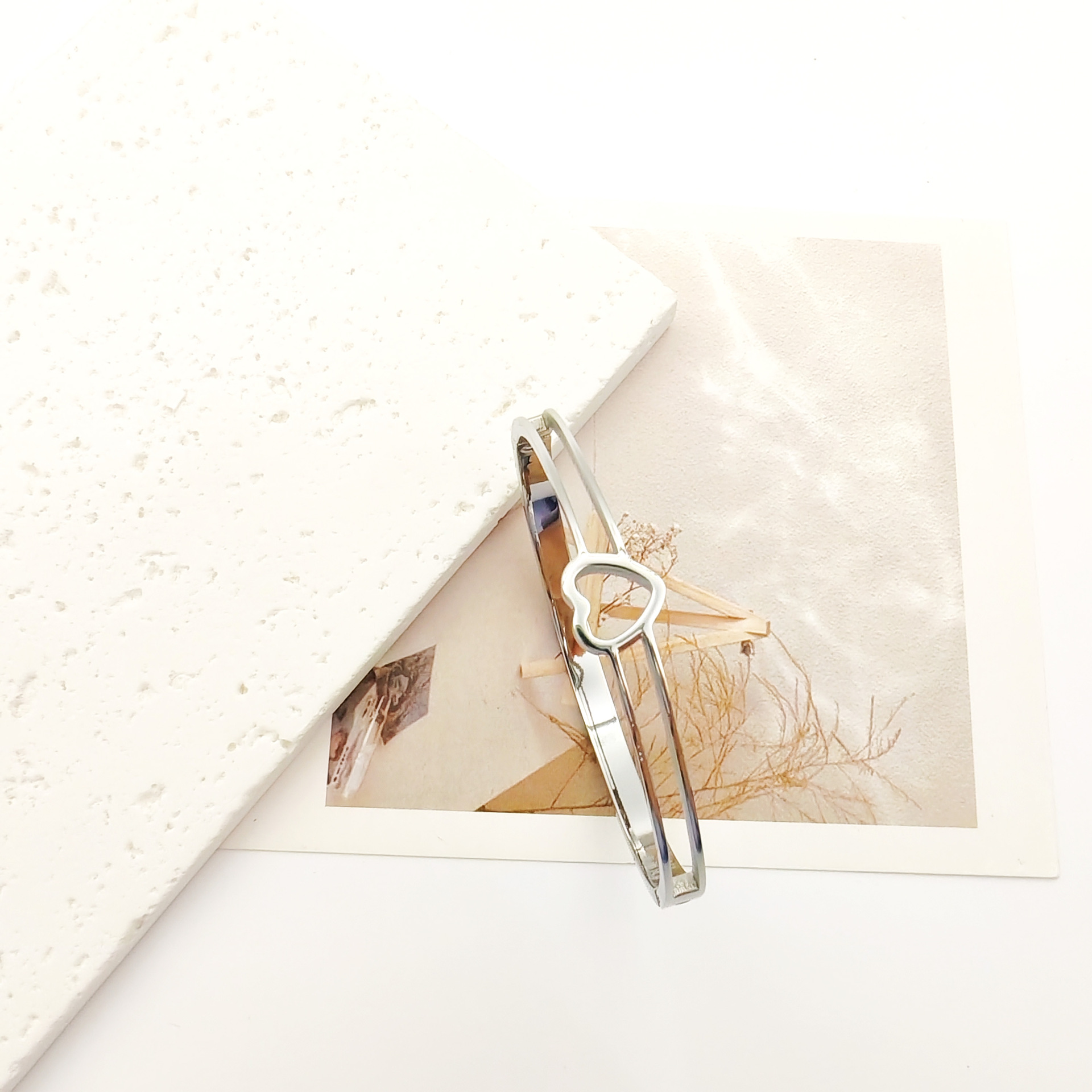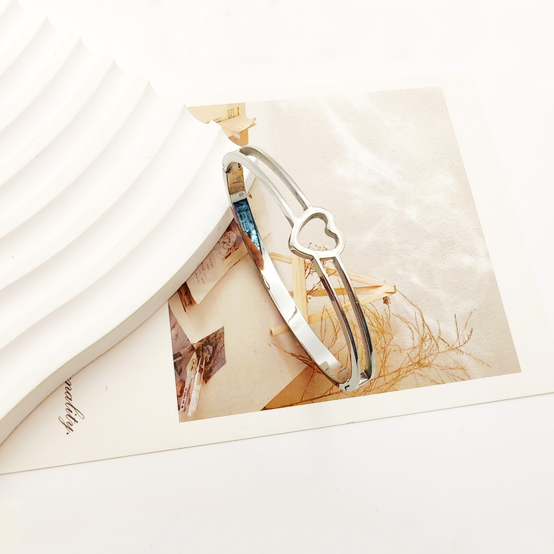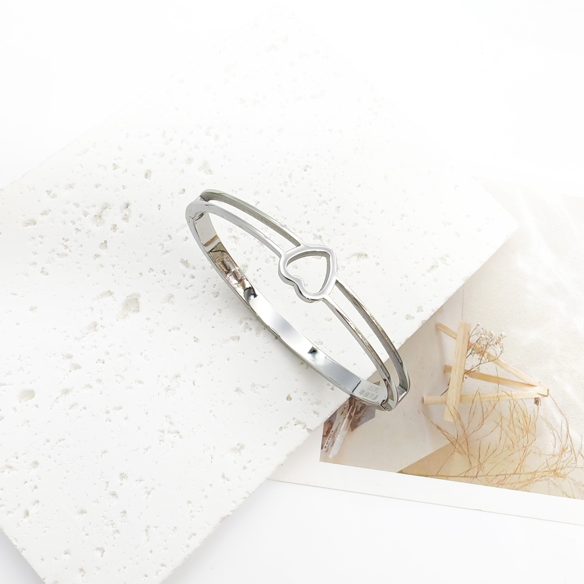 跨境批发不锈钢手镯男女款高级感不掉色饰品光面爱心钛钢手镯 English | 投诉