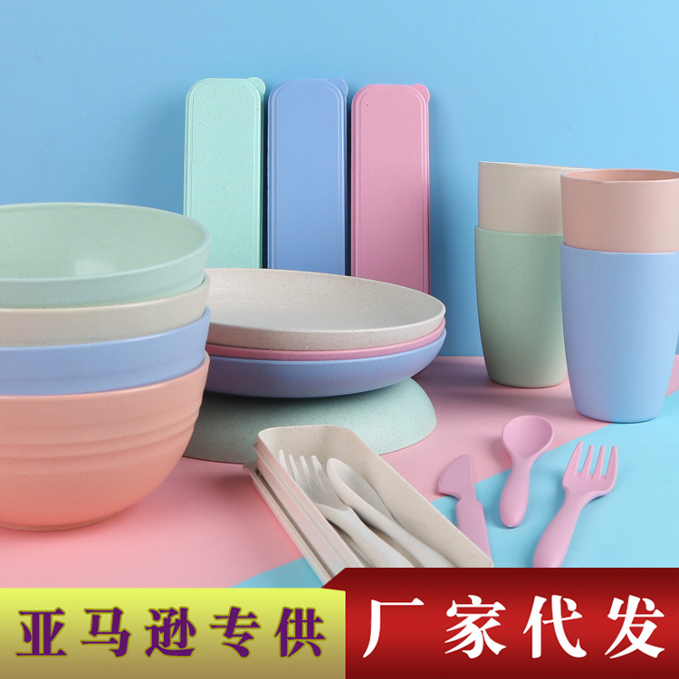 小麦秸秆餐具套装 碗杯盘套装 刀叉勺 吐骨碟 泡面碗 水杯 English | 投诉