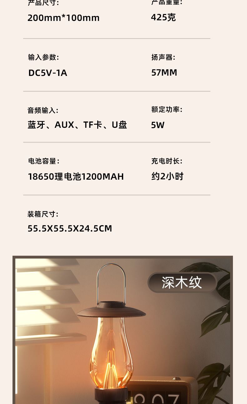功能: 蓝牙、AUX、TF卡、U盘、夜灯、FM、