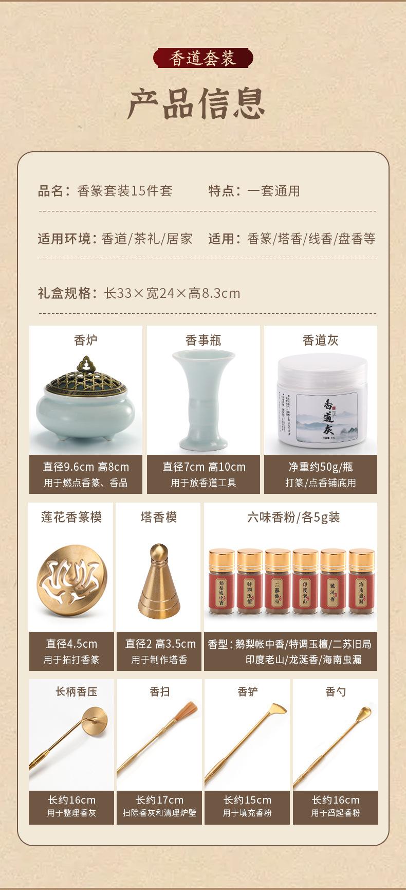 材质: 黄铜 货号: 香篆套装 产地: 中国 是否进口: 否 产品编号: 香篆套装 工艺: 电镀 包装: 礼盒包装 是否专利货源: 否 品牌: 其他 规格: 【香道】14件套(黄色礼盒) 重量: 0.5 kg/个