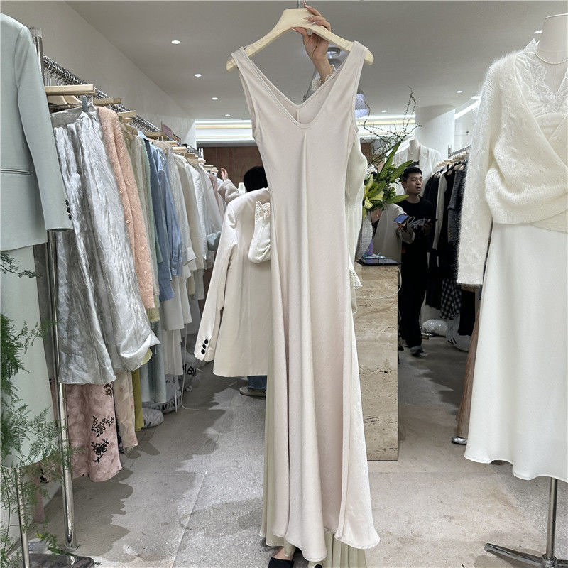十三行2025夏季高级感法式气质v领纯色背心吊带裙打底鱼尾连衣裙