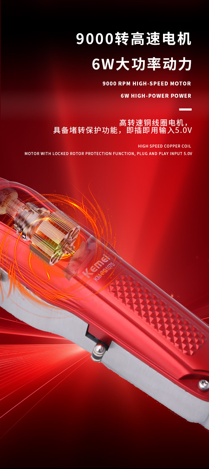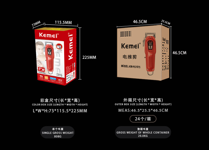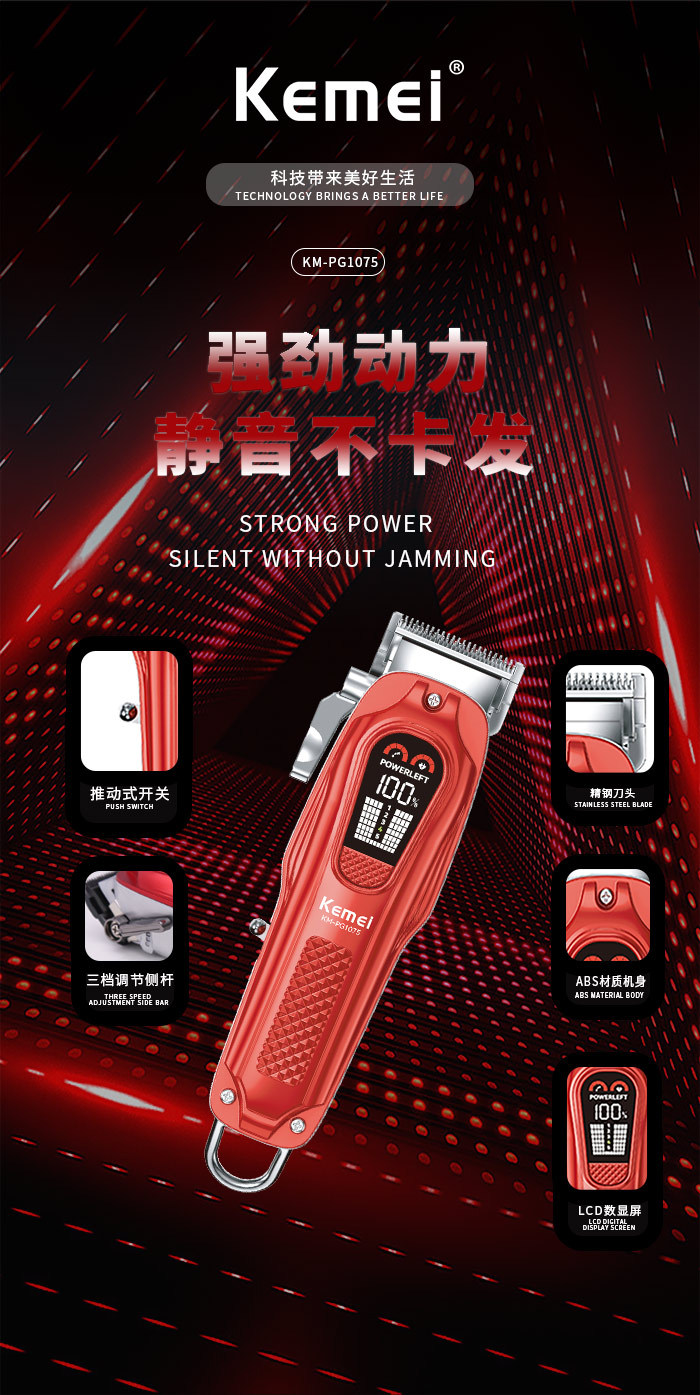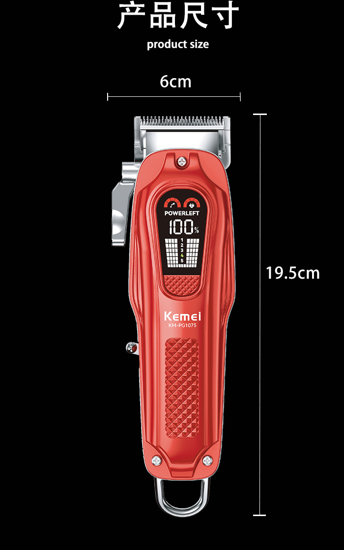 电源方式: 充电款 尺寸: 红色19.5*6 清洁方式: 无水洗 适用人群: 通用 是否防水: 否 电机类型: 无刷电机 刀头材质: 钛合金 货号: KM-PG1075 外壳工艺: 电镀 续航时长: 1-3h(含) 重量: 0.81 kg/套