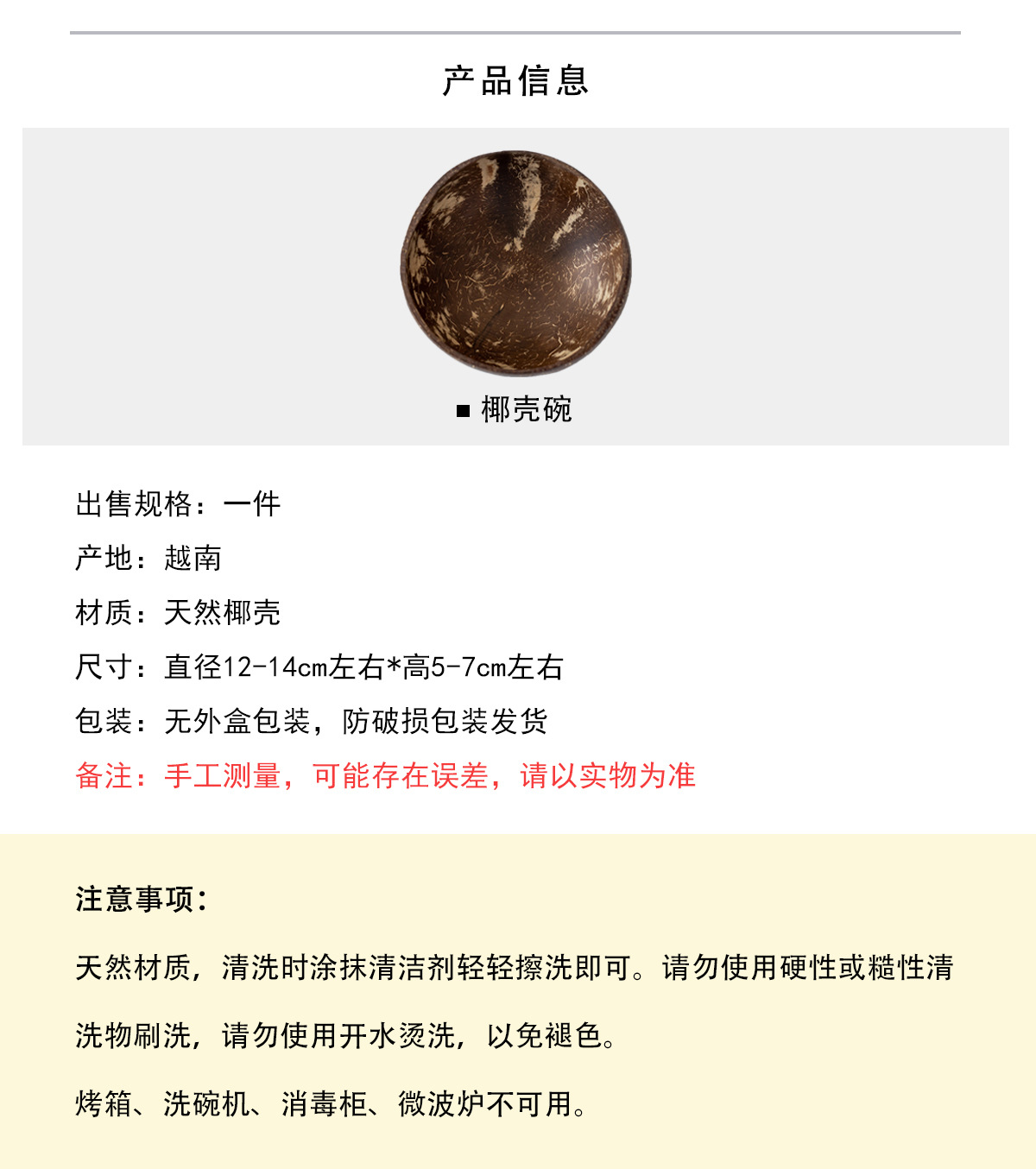 品牌: 无 是否进口: 是 原产国/地区: 越南 产品类别: 碗 货号: 7511 材质: 椰壳 适用人群: 成人 图案: 纯色 风格: ins风 形状: 不规则形 重量: 1.0 kg/个