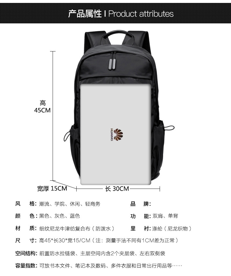 适用性别: 中性/男女均可 适用场景: 休闲旅行 材质: 牛津布 风格: 商务通勤 容量: 20-35L 功能: 护脊 上市年份季节: 2024年春季 货号: WH&8395 图案: 纯色 里料质地: 涤纶 重量: 0.6 kg/个