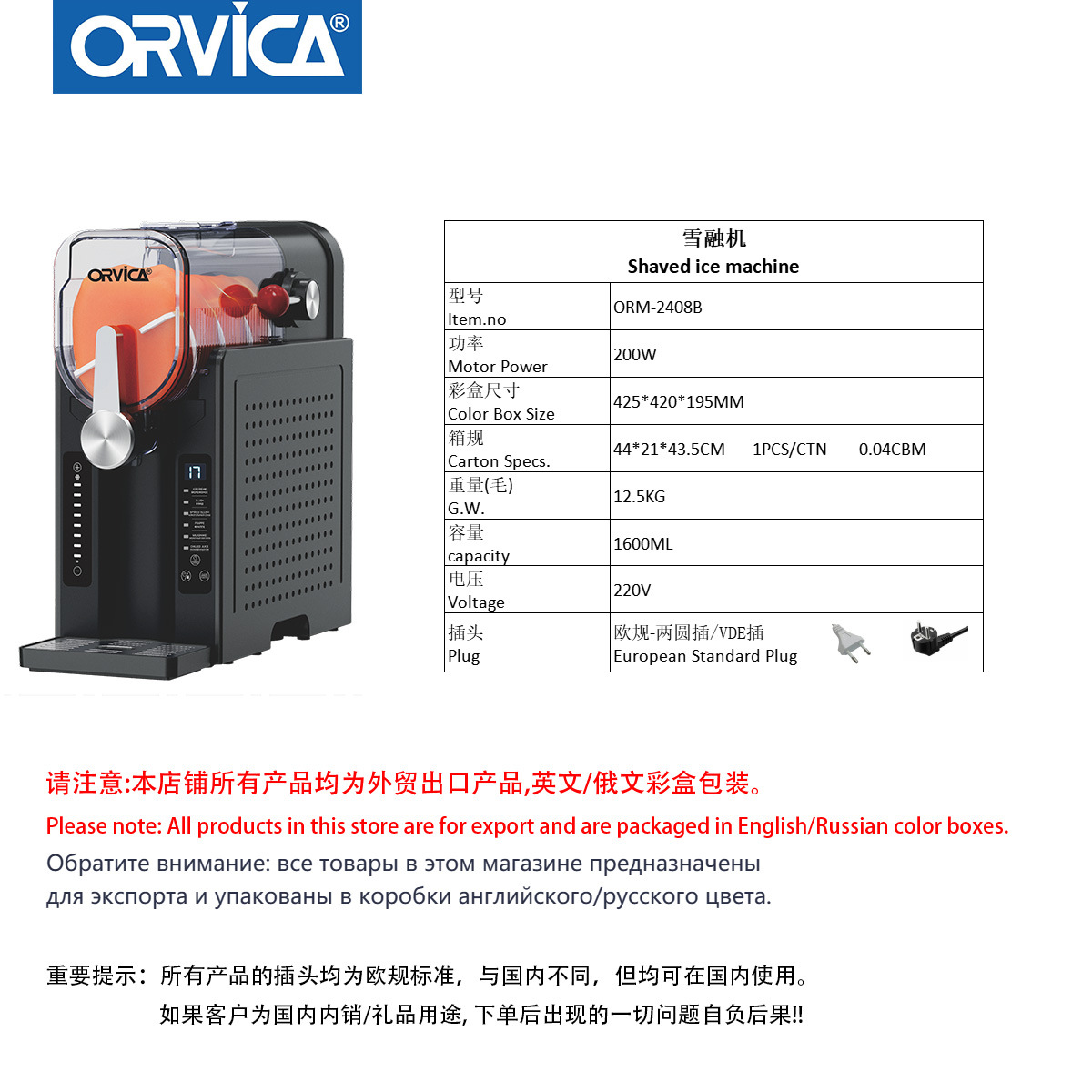 ORVICA跨境制冰机家用商用冰淇淋机全自动饮料冰沙机雪融机刨冰机 投诉