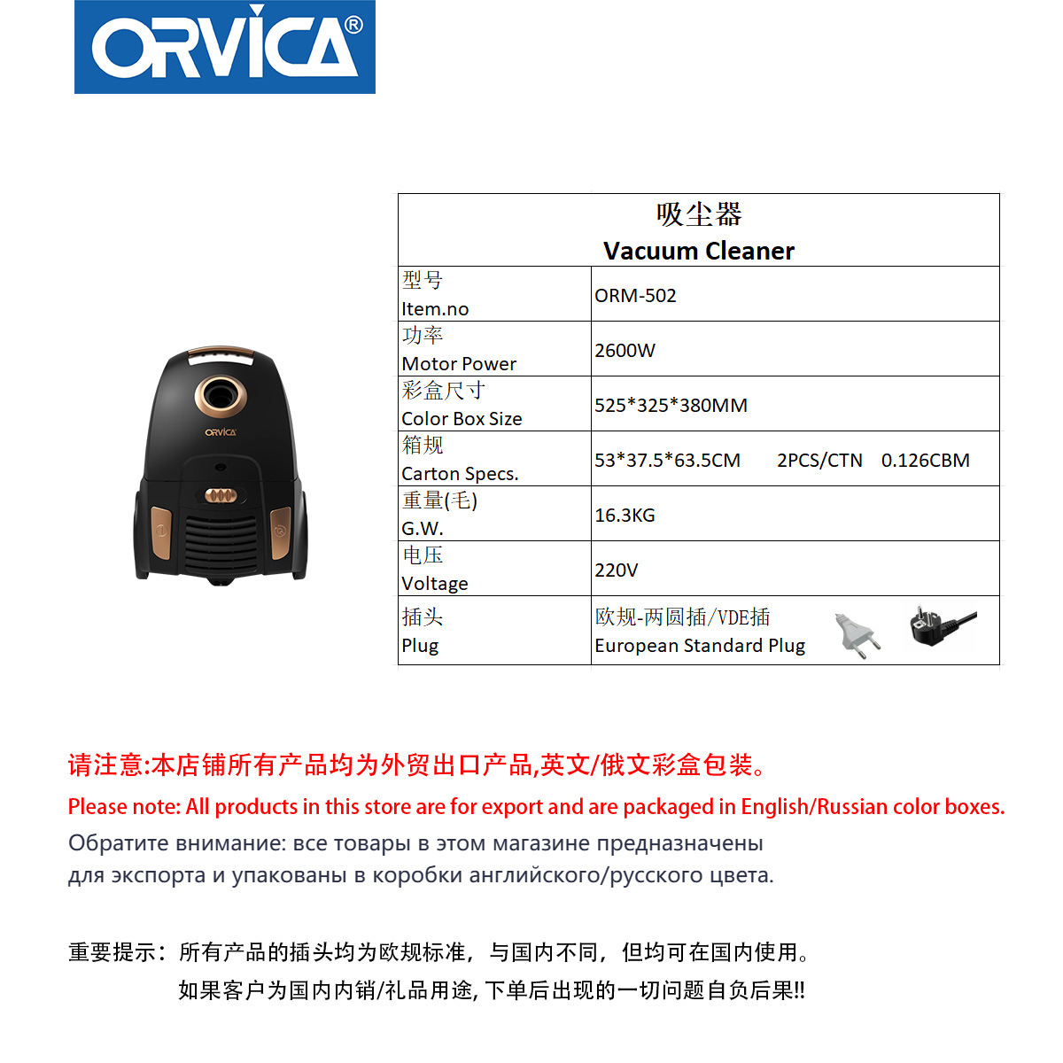 产品类别: 吸尘器 品牌: ORVICA 型号: ORM-502 货号: ORM-502 吸尘器款式: 手提式 吸尘器功能: 其他 储尘类型: 尘盒/尘桶 电源线长度: 约5米 特殊吸嘴: 扁吸嘴 额定电压: 111V~240V(含) 重量: 10.0 kg/台