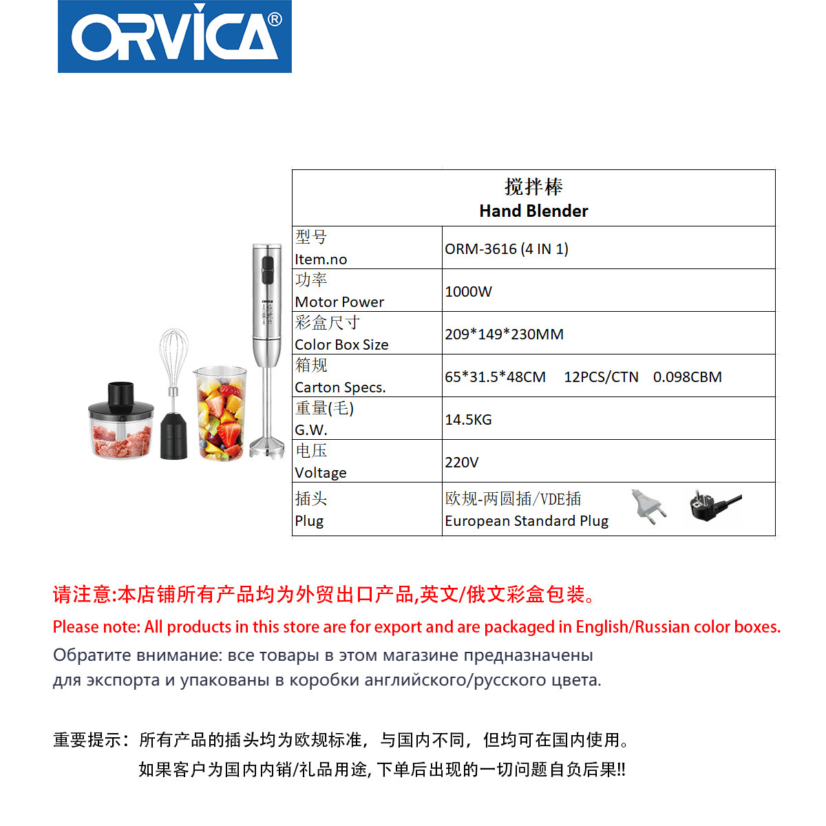 产品类别: 榨汁/搅拌/料理机 容量: 1L以下 3C证书编号: 2014010713742975 功能: 婴儿辅食,可调档,充电便携,低音降噪,蛋 品牌: ORVICA 颜色: ORM-3616 调速档位: 2档 额定电压: 111V~240V(含) 电机转速: 10000~19999转 产品尺寸: 套装 重量: 10.0 kg/个