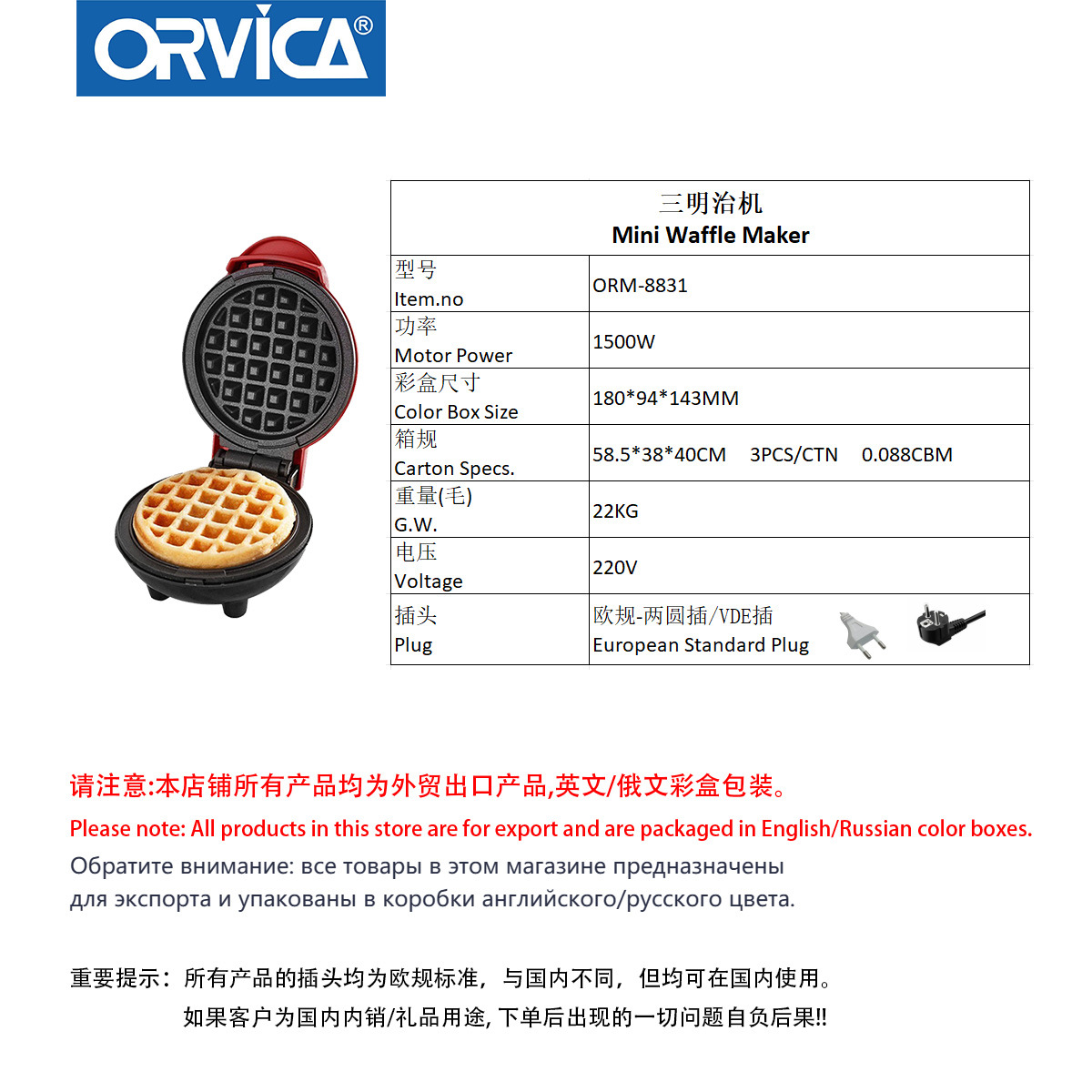 产品类别: 华夫饼机 品牌: ORVICA 型号: ORM-8831 货号: ORM-8831 有无烘烤架: 有 有无防尘盖: 有 面包槽数: 单片 定时档位: 手动 功能: 加热,烤肉,烘烤,煎蛋,解冻 额定电压: 220V 重量: 10.0 kg/台