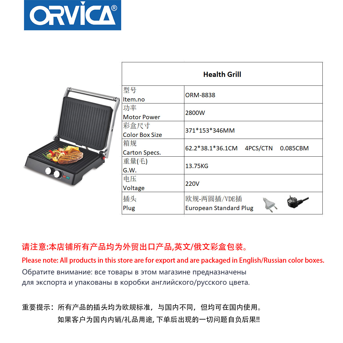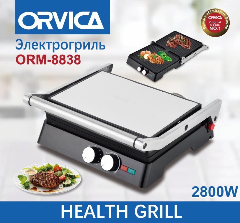 产品类别: 牛排机 品牌: ORVICA 型号: ORM-8838 货号: ORM-8838 有无烘烤架: 有 有无防尘盖: 有 面包槽数: 2片 定时档位: 手动 功能: 加热,烤肉,烘烤,煎蛋,解冻 额定电压: 220V 重量: 10.0 kg/台